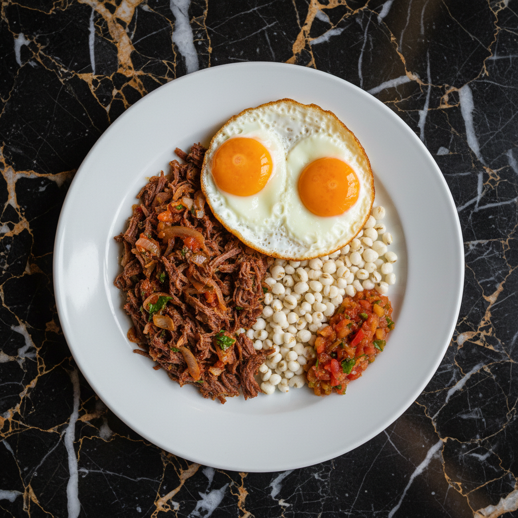 A hearty and flavorful dish from La Paz, Bolivia, featuring shredded dried beef (charque) simmered with onions, tomatoes, and spices, often served with mote (hominy), fried eggs, and llajua (a spicy salsa).