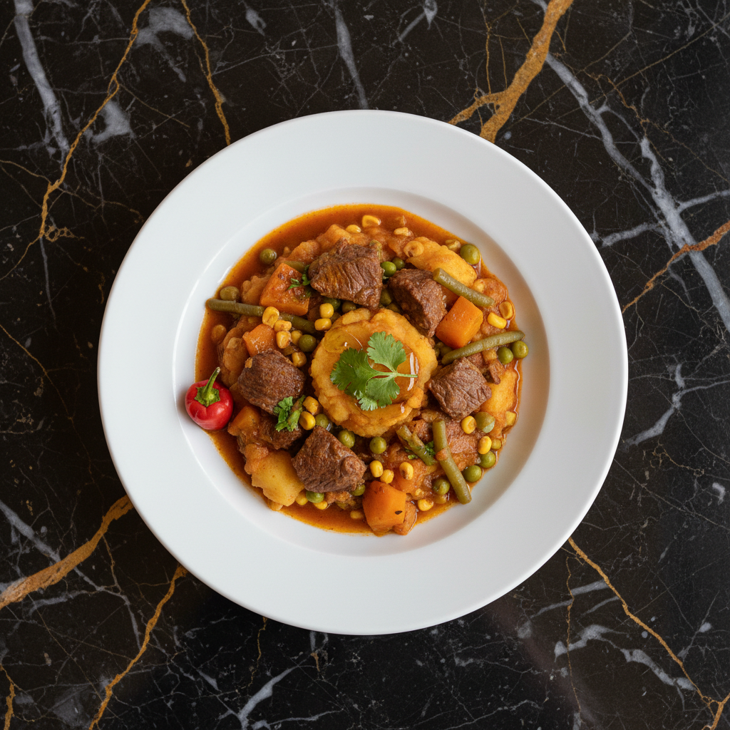 A hearty and comforting Chilean beef stew, traditionally made with dried meat (charqui), but this modern version uses fresh beef. It's a staple in Chilean homes, known for its rich flavors and satisfying texture.