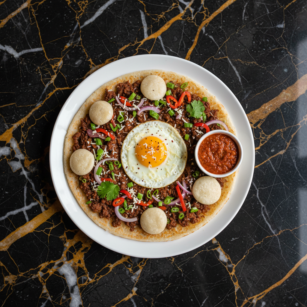 Chatamari is a popular Newari dish often referred to as 'Nepali pizza.' It's a thin rice crepe topped with various ingredients, typically minced meat, vegetables, and sometimes an egg and cheese. It's a quick and flavorful street food.