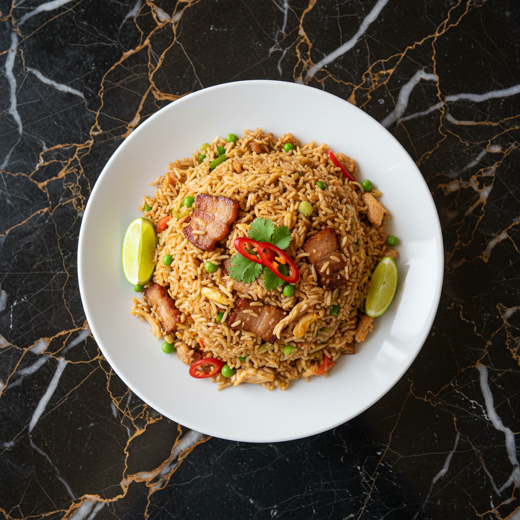 Chaulafan is the Ecuadorian version of Chinese fried rice, a popular dish that reflects the fusion of Chinese and Ecuadorian culinary influences. This version includes pork and chicken, along with vegetables and scrambled eggs.