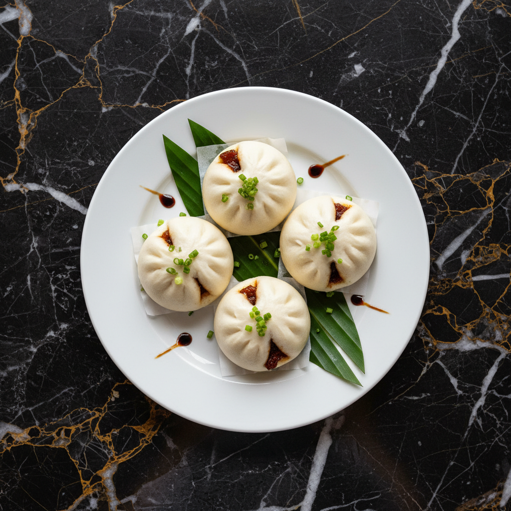Fluffy, slightly sweet steamed buns encasing a savory and tender Cantonese BBQ pork (char siu) filling. A quintessential dim sum classic, these buns are known for their pillowy texture and the characteristic split top.