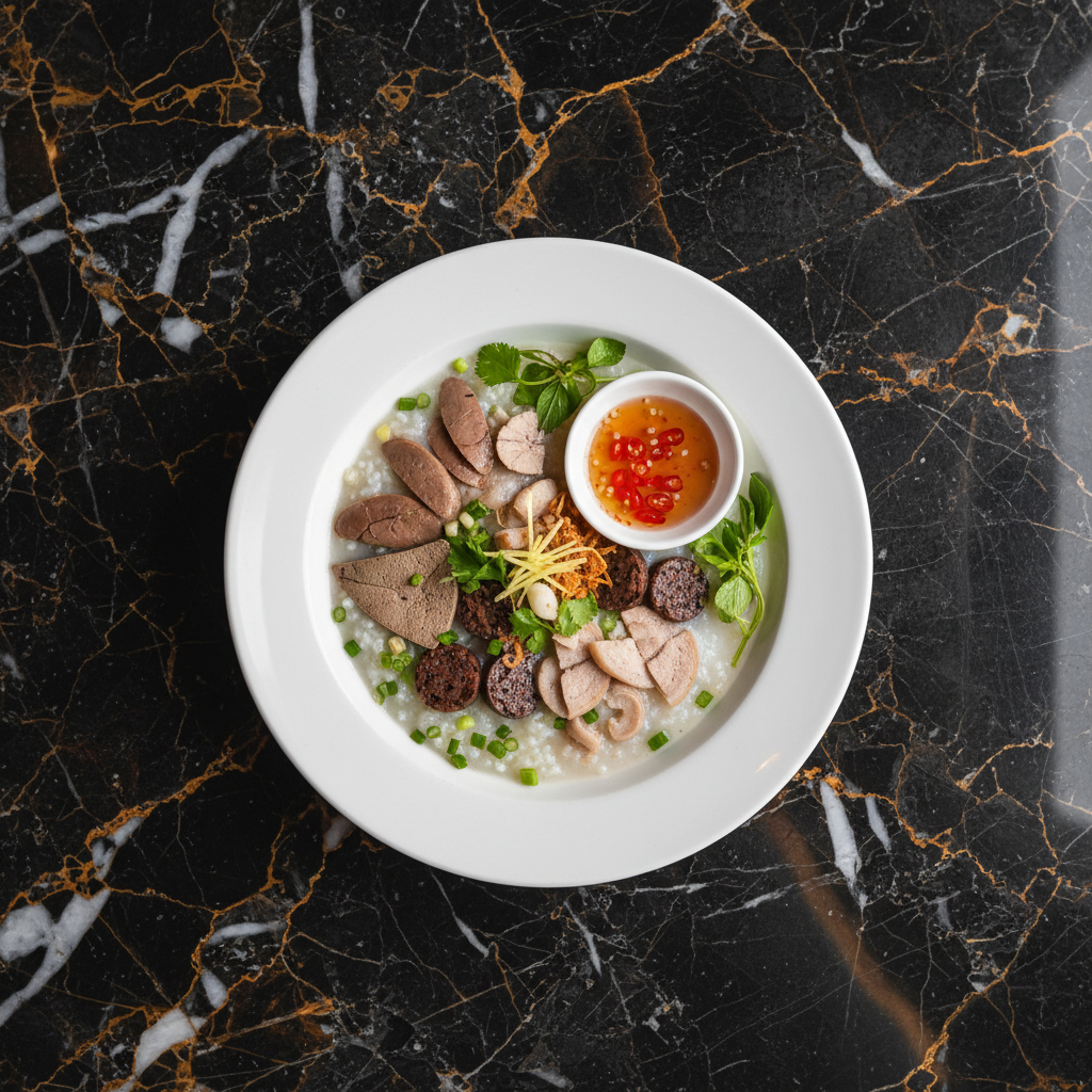 A deeply nourishing and comforting Vietnamese rice porridge (congee) simmered with a variety of carefully prepared pork offal. This dish is a staple for breakfast or a warming meal, celebrated for its rich flavor and high nutritional content.