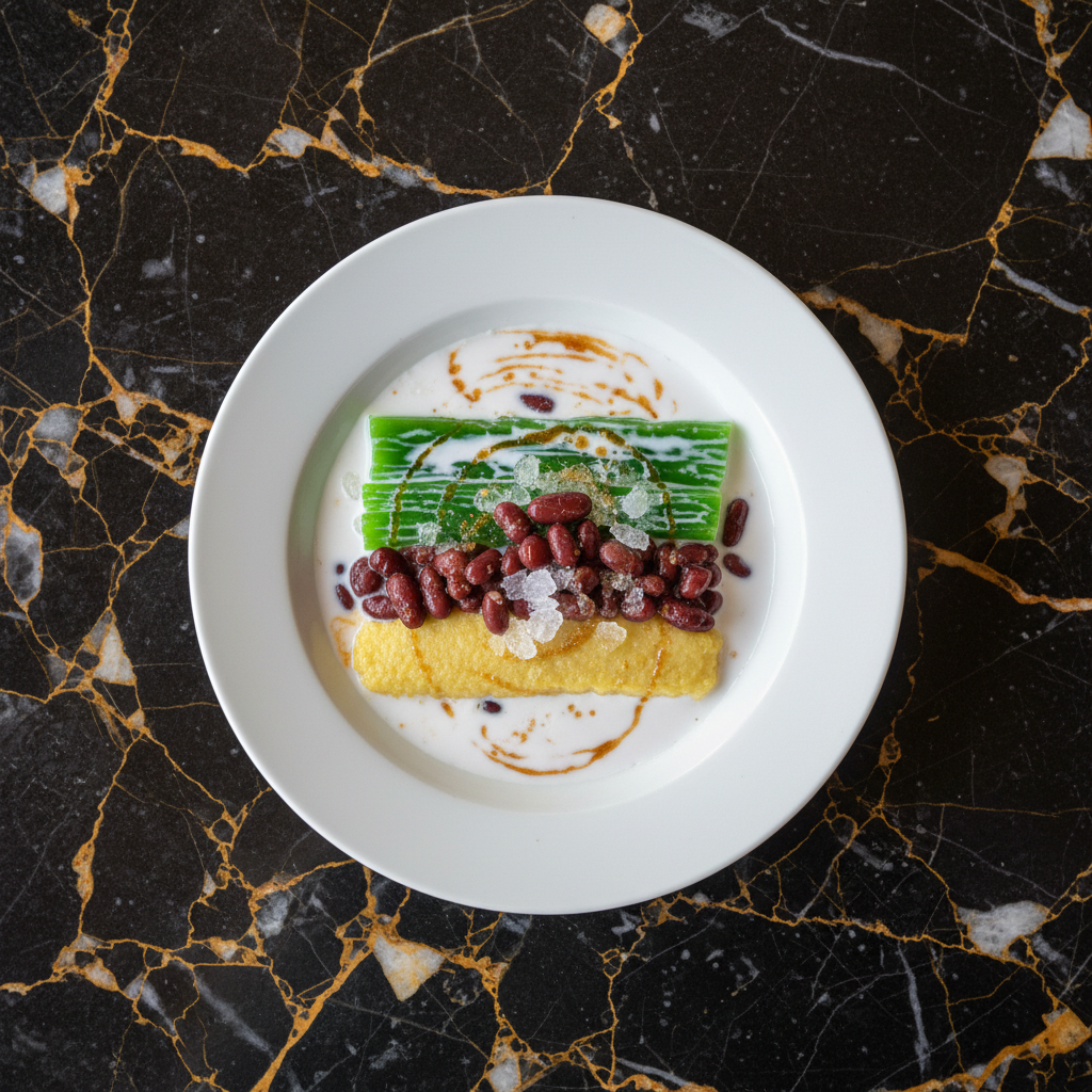 A visually stunning and refreshing Vietnamese dessert featuring distinct layers of sweet red beans, creamy mung beans, and vibrant pandan jelly, all topped with rich coconut milk and crushed ice. It's a delightful play of textures and flavors.