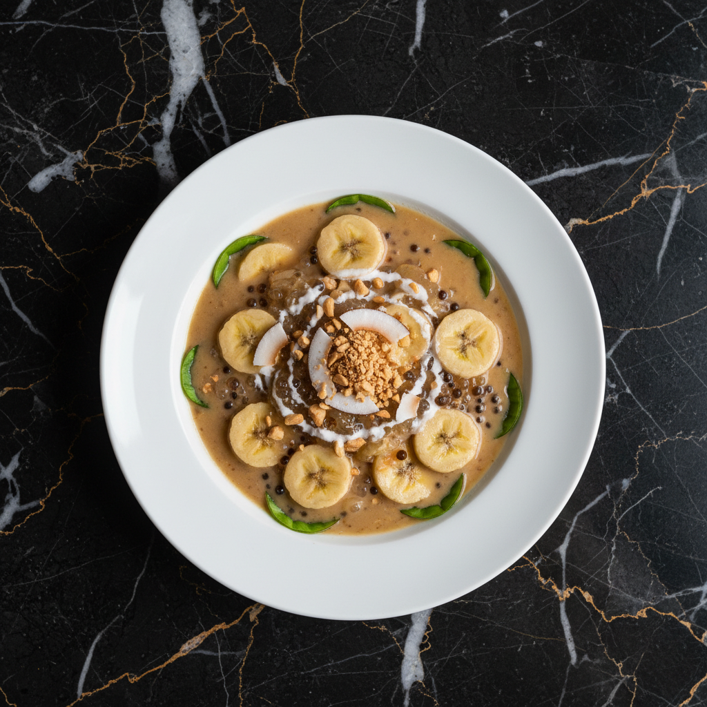 A comforting and creamy Vietnamese dessert soup featuring tender slices of ripe banana simmered in rich coconut milk, sweetened and thickened with small tapioca pearls. Best served warm.