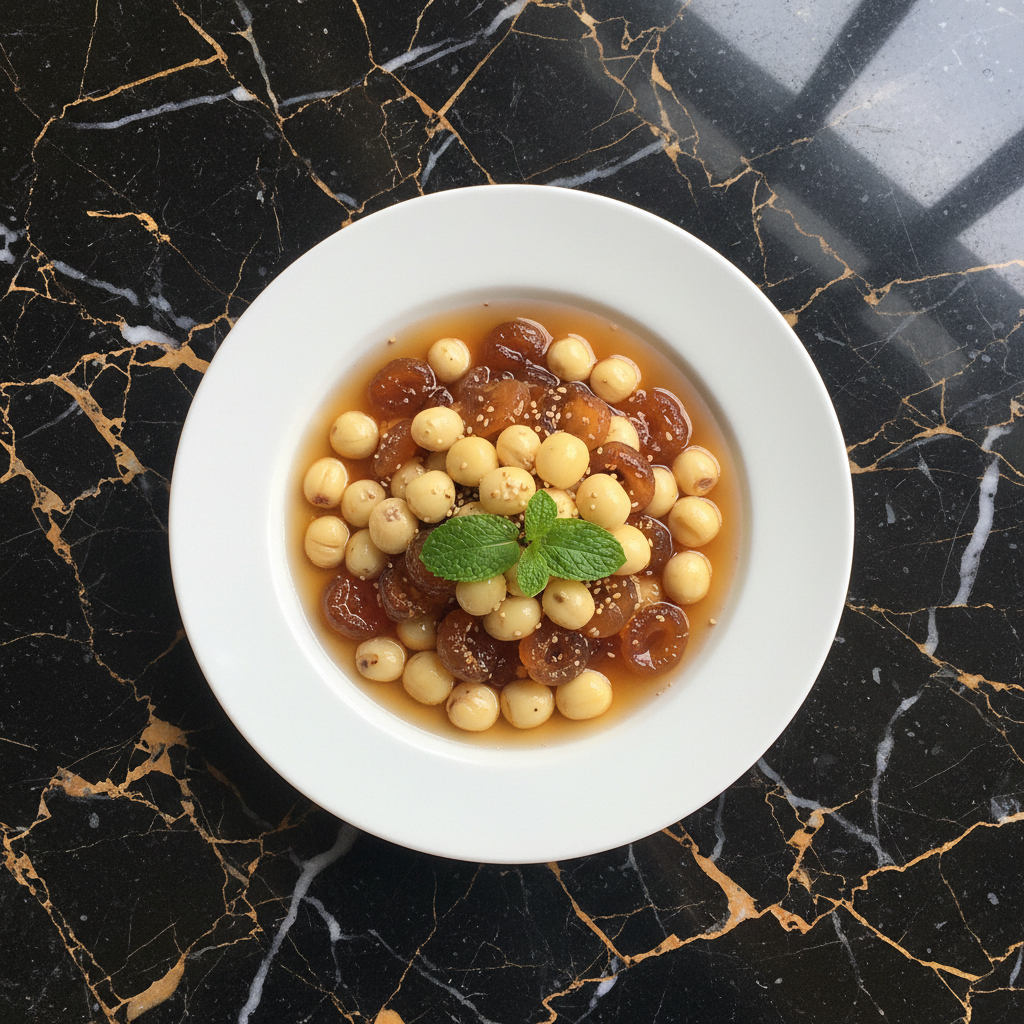 A delicate and elegant Vietnamese dessert soup featuring tender lotus seeds simmered in a clear, lightly sweetened syrup with the subtle fruitiness of longan and the fragrant aroma of pandan leaves. This chè is perfect served warm or chilled.