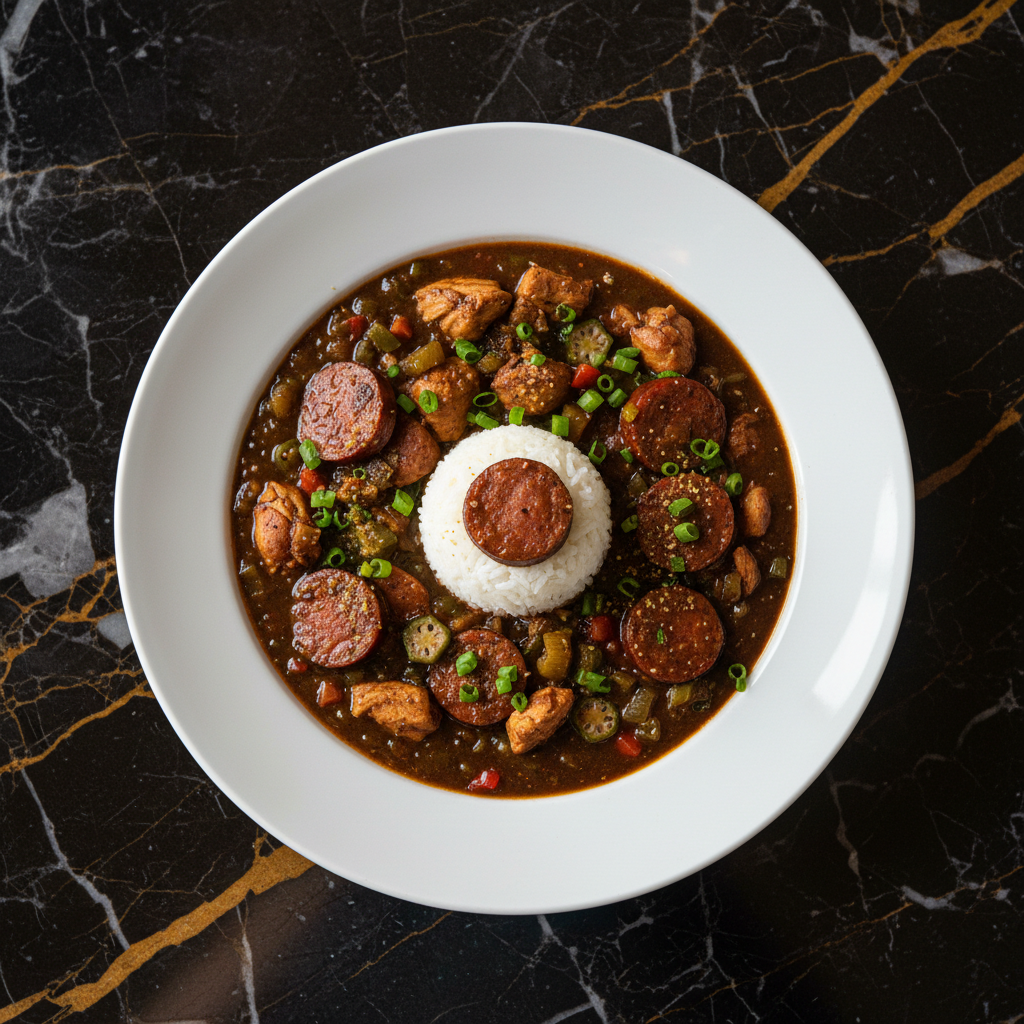 A rich and deeply flavored dark roux-based gumbo, featuring tender chicken, smoky andouille sausage, and the essential 'holy trinity' of vegetables, thickened with okra. A true taste of Louisiana soul.