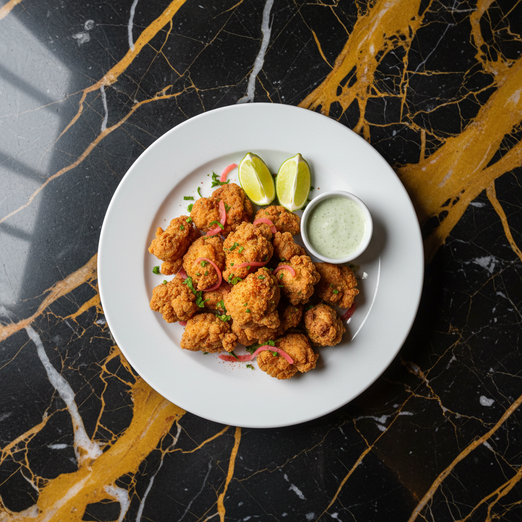 Crispy, bite-sized pieces of fried chicken, marinated in citrus and spices, offering a delightful crunch and savory flavor. It's a popular appetizer and party food.