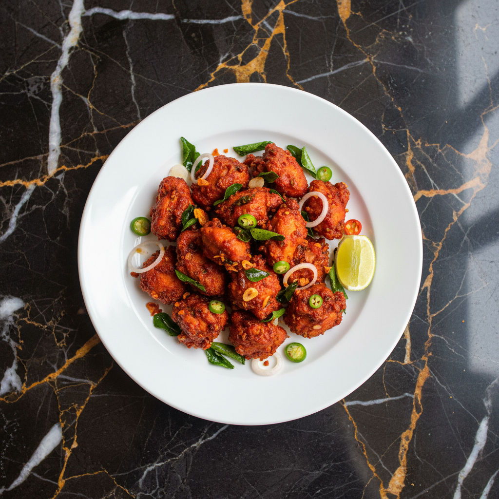 A popular and fiery Indian appetizer from Chennai, featuring bite-sized pieces of marinated chicken that are deep-fried until crispy and then tossed with fragrant curry leaves and spices. It's known for its vibrant red color and spicy kick.