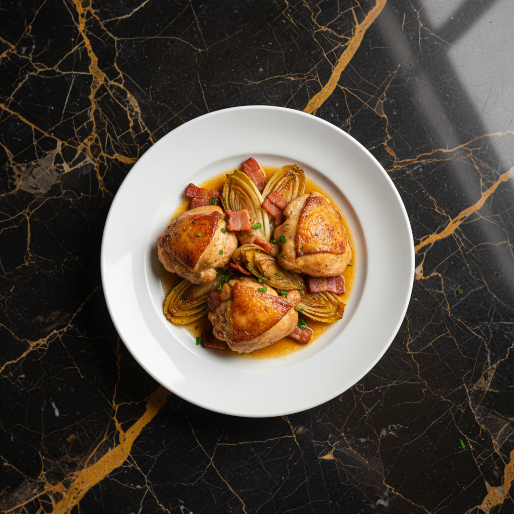 Tender chicken thighs braised with the slightly bitter Belgian endive, complemented by bacon and a savory sauce. This dish offers a delightful balance of flavors and textures, showcasing the unique character of Belgian cuisine.