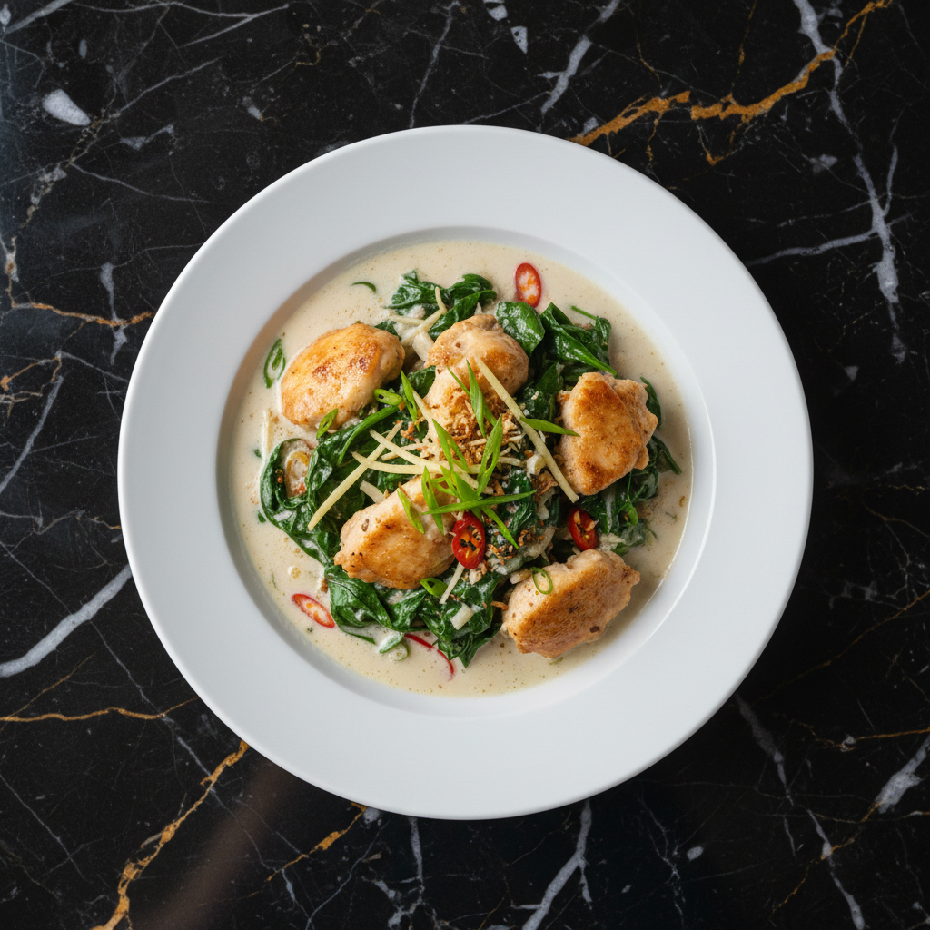 A comforting and flavorful dish featuring tender chicken pieces simmered in creamy coconut milk with a medley of fresh greens and aromatic ginger. This dish highlights the use of readily available local ingredients.