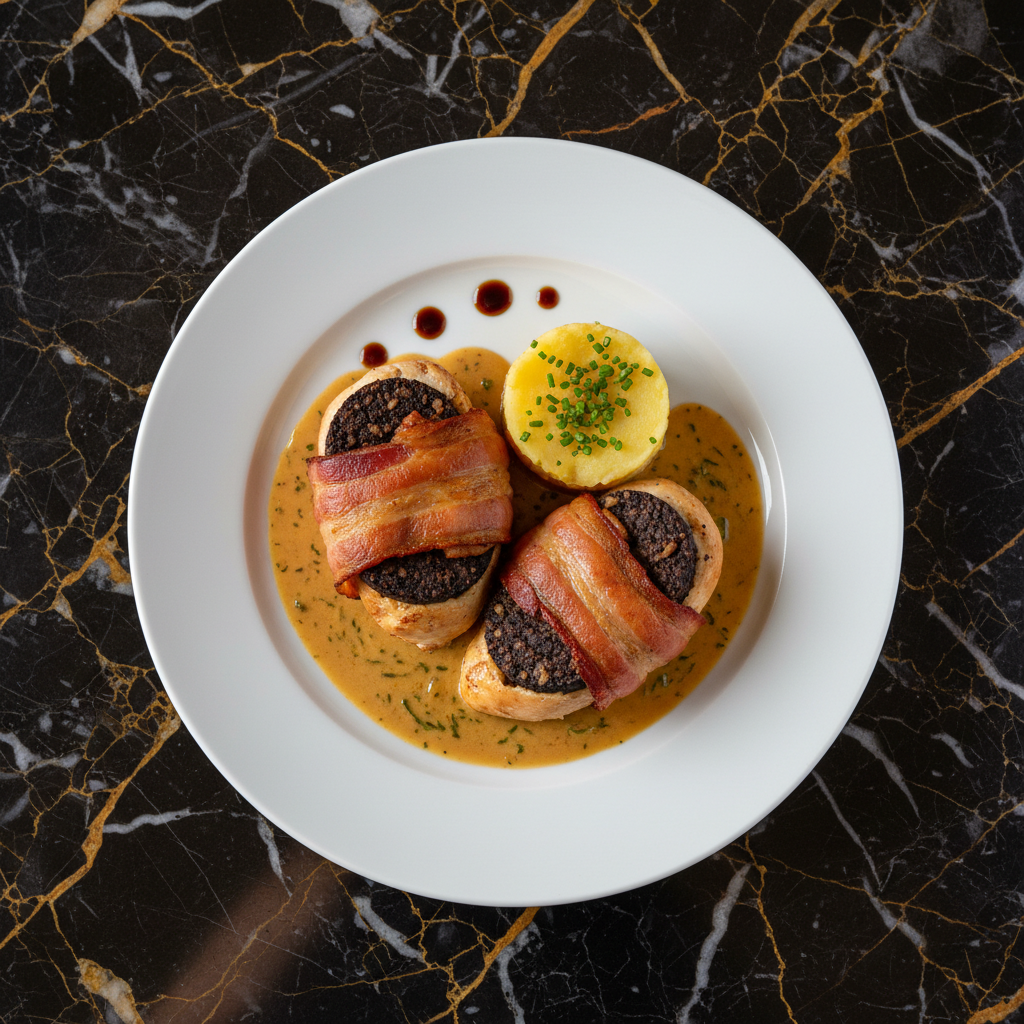 A rich and elegant dish featuring chicken breast stuffed with black pudding and haggis, wrapped in bacon, and served with a whisky cream sauce. It's a sophisticated take on traditional Scottish flavors.