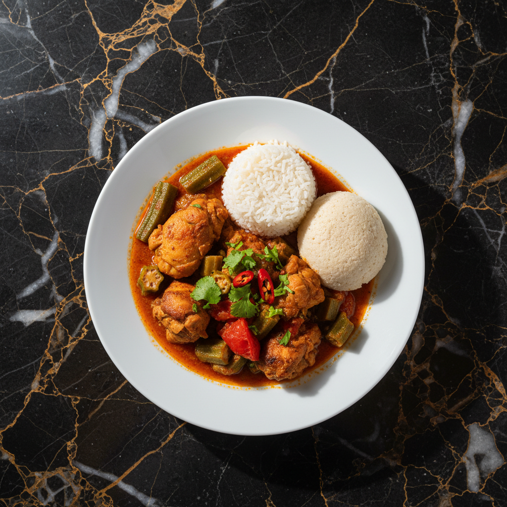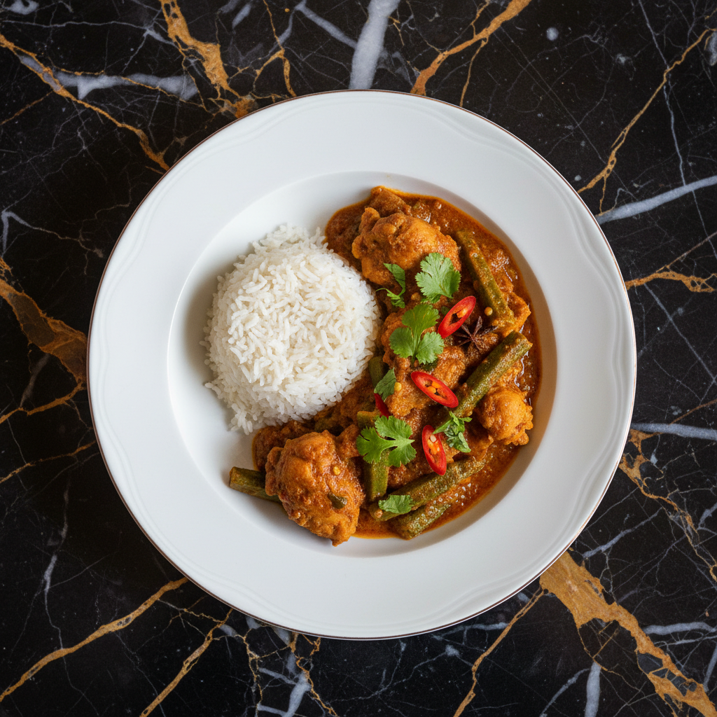 A flavorful and tender chicken curry featuring the unique texture of okra, simmered in a rich Mauritian spice blend.