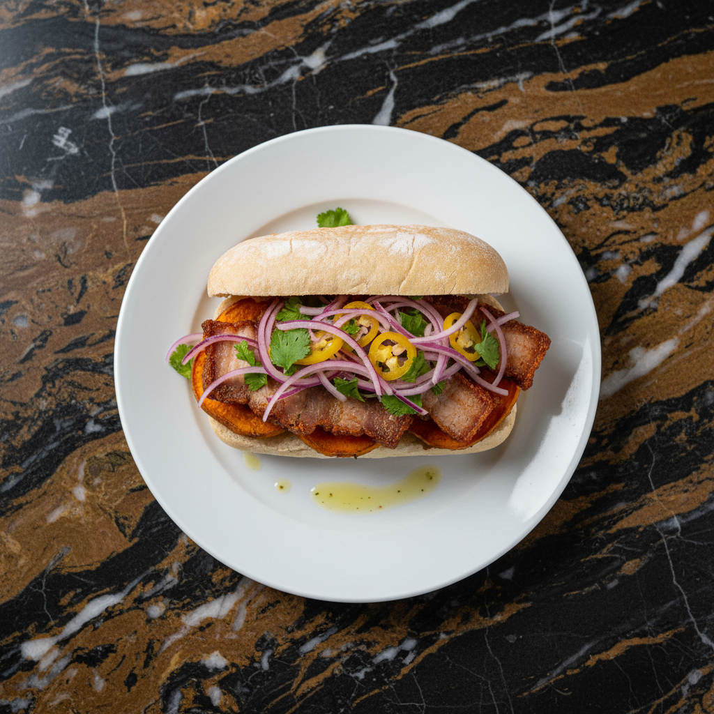 A quintessential Peruvian breakfast icon, this sandwich features incredibly crispy, slow-cooked pork belly (chicharrón) nestled in a fresh bread roll, complemented by sweet, fried sweet potato slices and a vibrant salsa criolla.