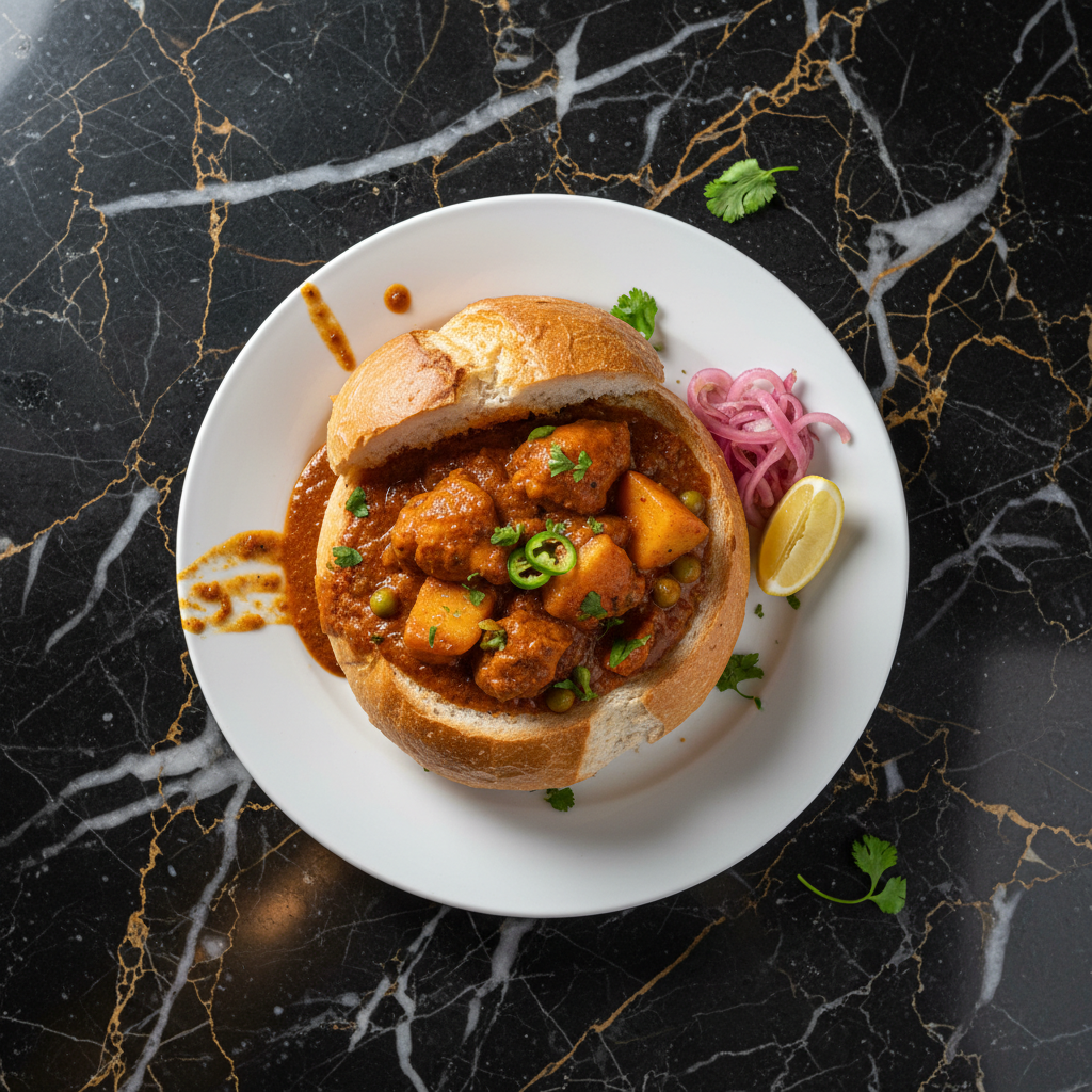A beloved South African street food classic, this 'bunny chow' features a rich, aromatic chicken curry served in a hollowed-out bread loaf. It's a hearty and flavorful meal, perfect for a casual lunch or dinner.