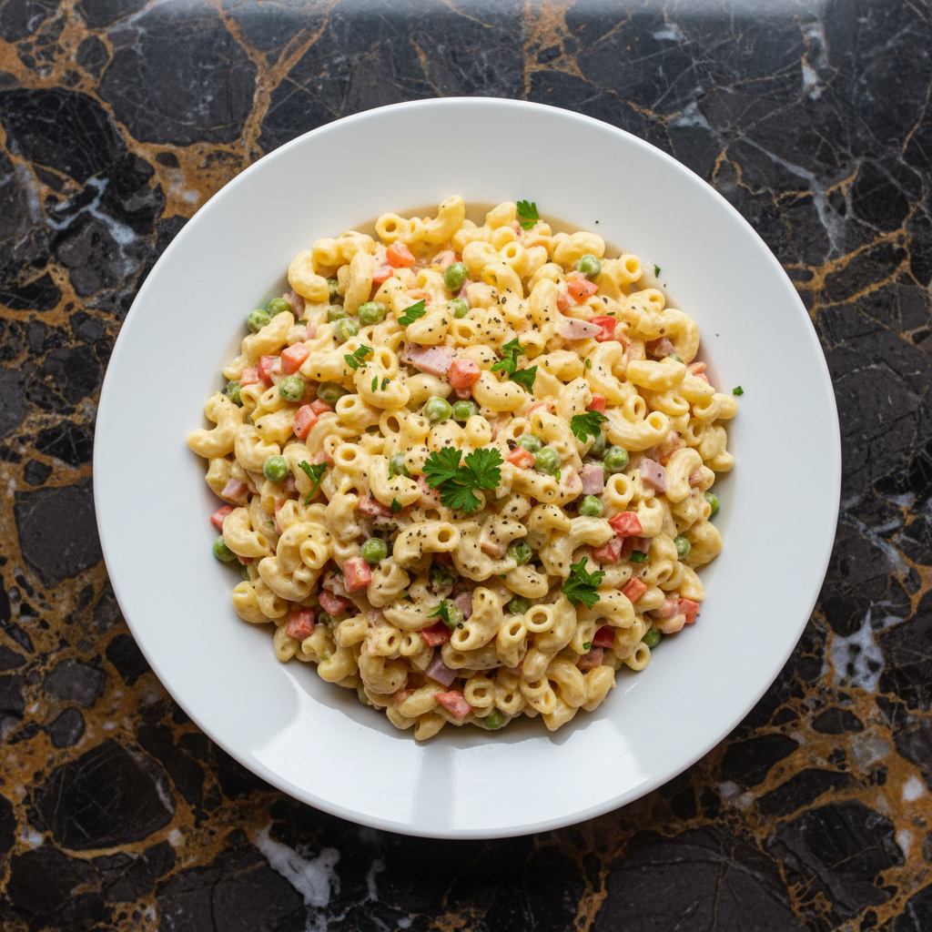 A creamy and colorful macaroni salad, popular as a side dish in the Dominican Republic. It features elbow macaroni mixed with mayonnaise, finely chopped vegetables, and seasonings, offering a refreshing and satisfying complement to any meal.