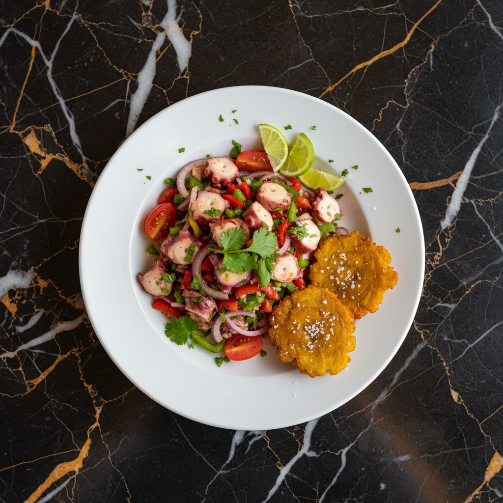 A refreshing and vibrant Puerto Rican-style octopus salad, featuring tender octopus mixed with crisp vegetables and a zesty vinaigrette. It's a perfect appetizer or light meal, often served with tostones.