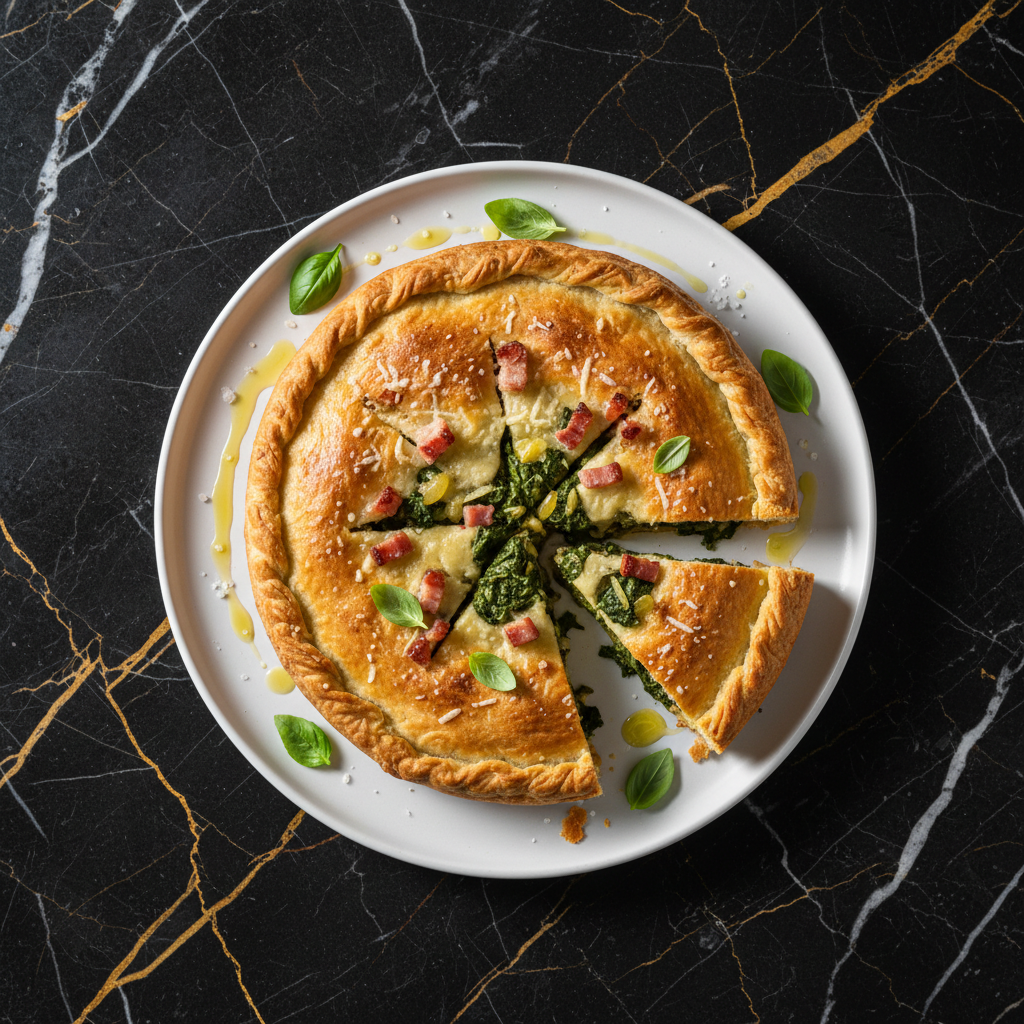 Erbazzone Sammarinese is a savory pie originating from San Marino, characterized by its filling of seasonal greens, onions, pancetta, and Parmesan cheese, all encased in a crisp, flaky pastry. It highlights the region's agricultural bounty and traditional peasant cuisine.