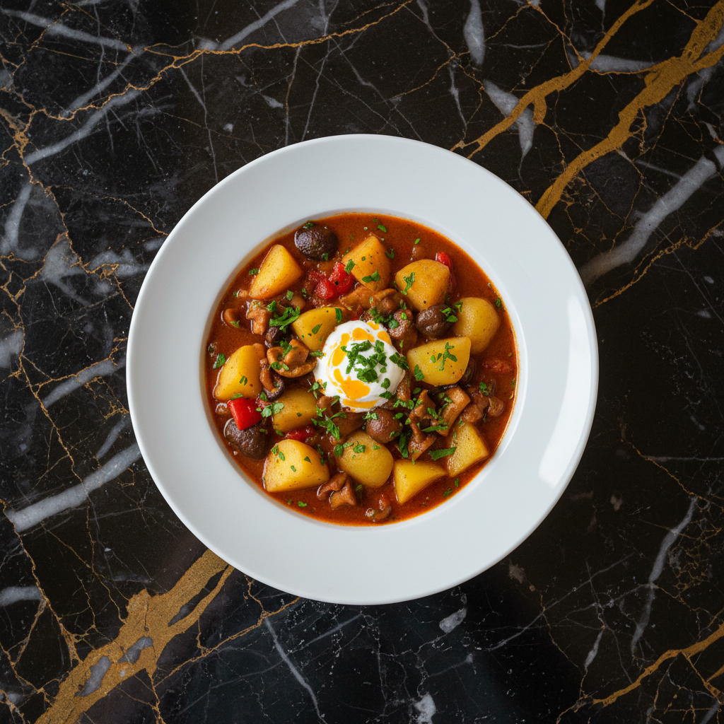 A hearty and comforting Austrian potato and mushroom goulash, featuring tender potatoes and earthy mushrooms simmered in a rich, paprika-spiced broth. This one-pot dish is a staple in Austrian cuisine, offering a warming and satisfying meal, often enjoyed during colder months.