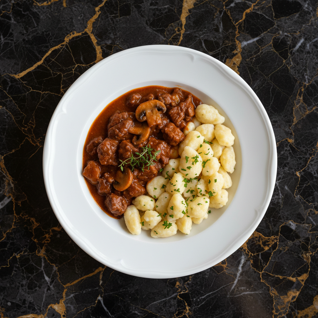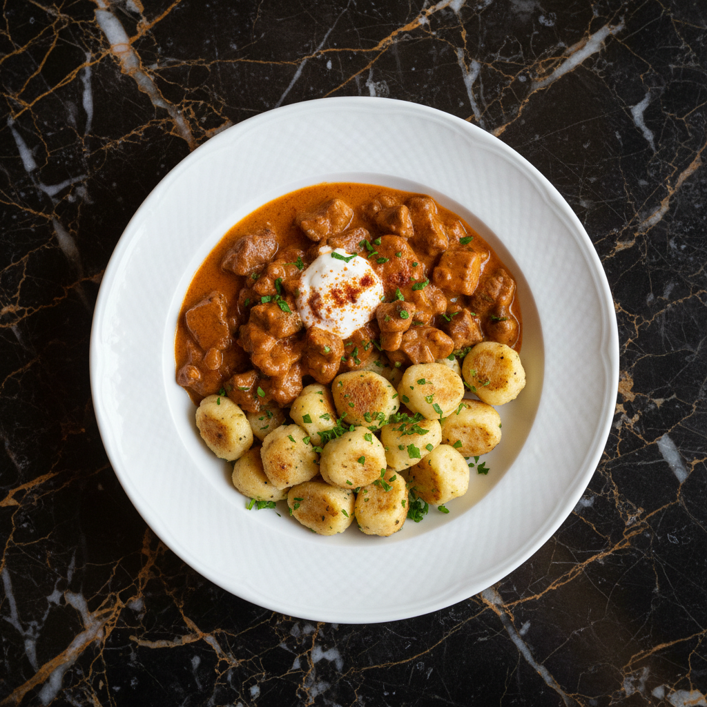 A rich and tender veal stew, inspired by forest flavors, slow-cooked with mushrooms and paprika, served with traditional Hungarian nokedli (dumplings). This dish showcases the earthy notes of mushrooms and the comforting texture of tender veal.
