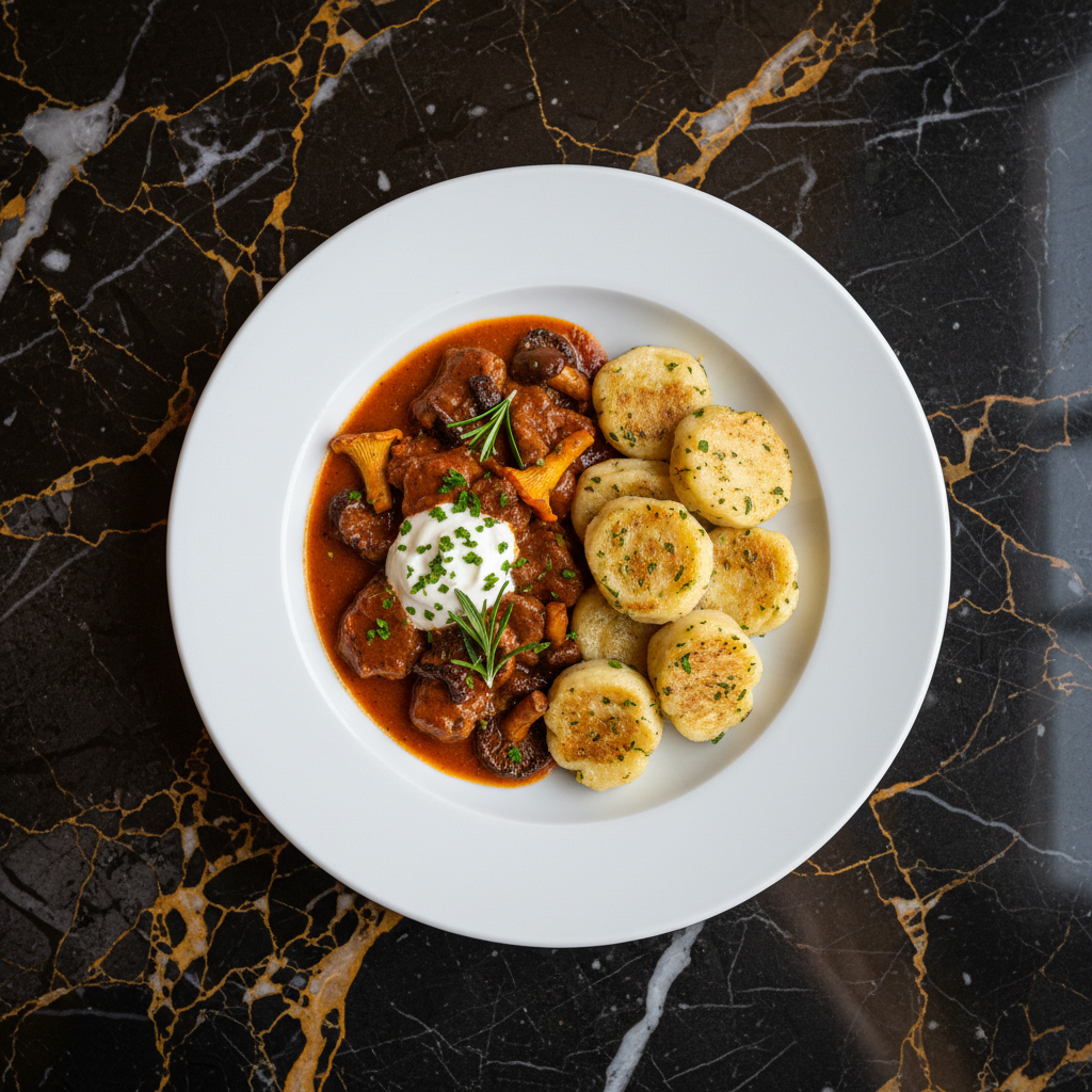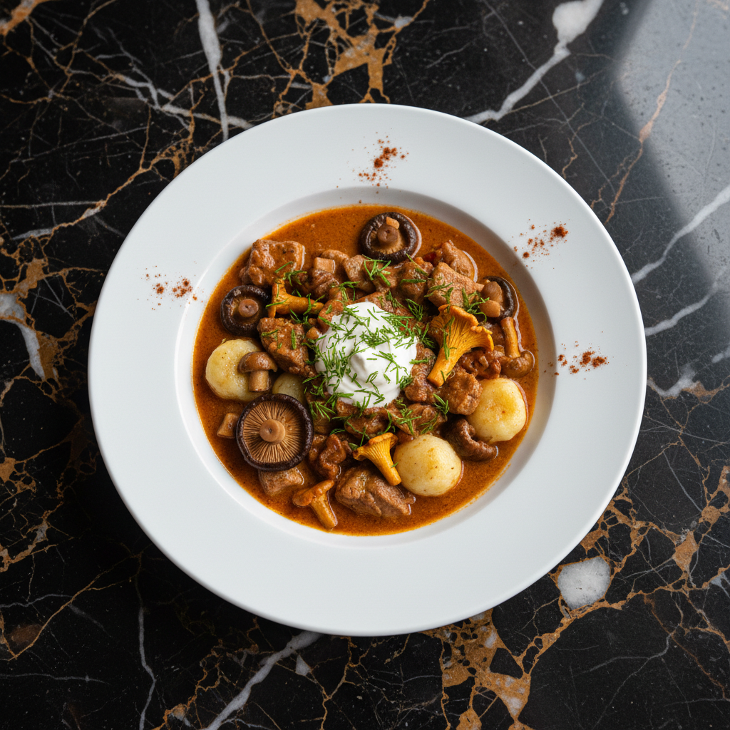 A rich and earthy veal and mushroom stew, infused with the quintessential Hungarian paprika, served alongside fragrant, spiced dumplings (fลฑszeres galuska). This dish highlights the forest's bounty with a variety of mushrooms and tender veal, simmered in a creamy, paprika-spiced sauce.