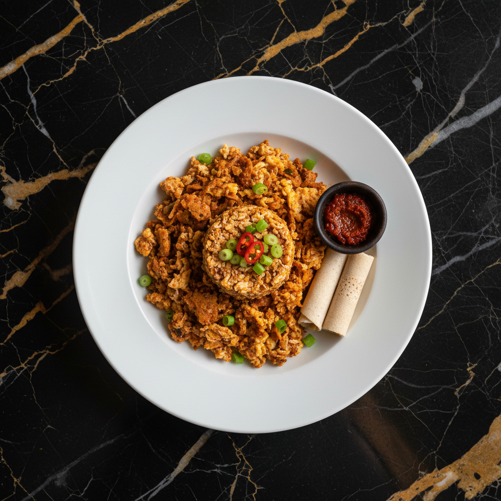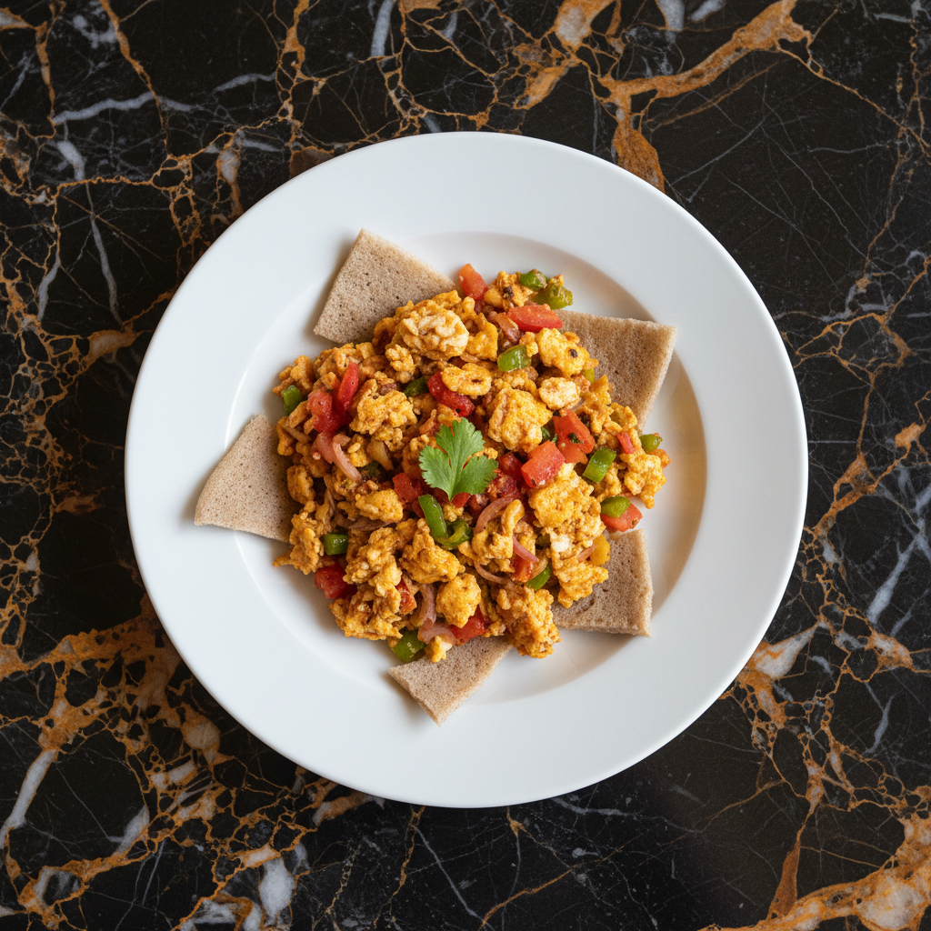 A simple yet flavorful Ethiopian breakfast dish featuring scrambled eggs cooked with spiced clarified butter (niter kibbeh), berbere spice, and torn pieces of day-old injera. It's a hearty and satisfying way to start the day.