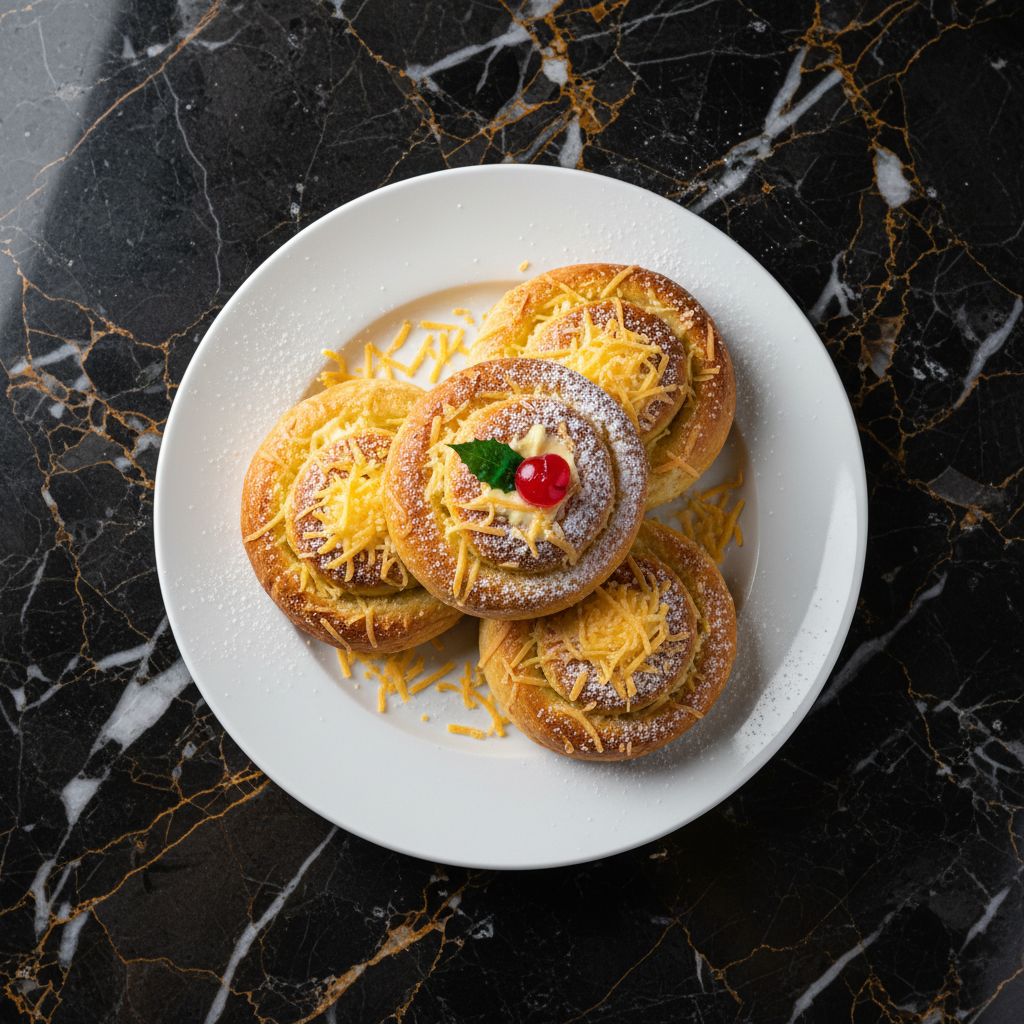 Filipino sweet brioche - a rich, buttery, and slightly sweet bread topped with grated cheese and sugar. Traditionally enjoyed during Christmas and special occasions.