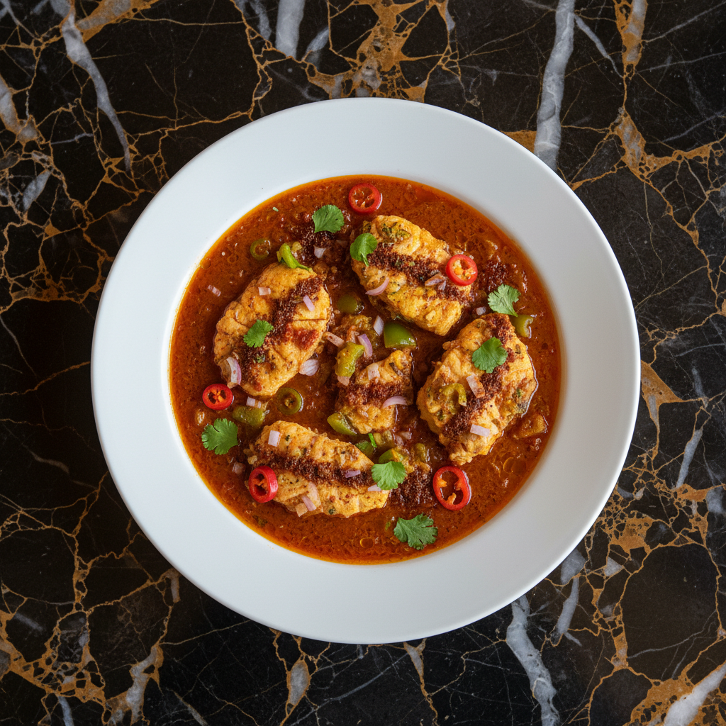 A flavorful and moderately spicy fish stew, popular in Eritrean and Ethiopian cuisine. It features tender fish simmered in a rich tomato-based sauce with aromatic spices like turmeric and ginger, often enhanced with the distinctive berbere spice blend.