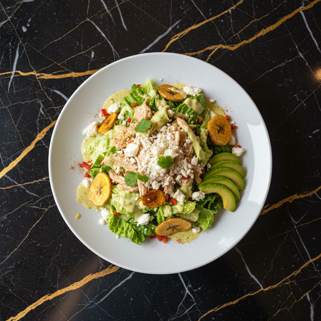 A refreshing Venezuelan take on the classic Caesar salad, featuring crisp romaine, a creamy dressing, crunchy croutons, and freshly grated Parmesan. This version often omits anchovies, focusing on the bright, tangy flavors.