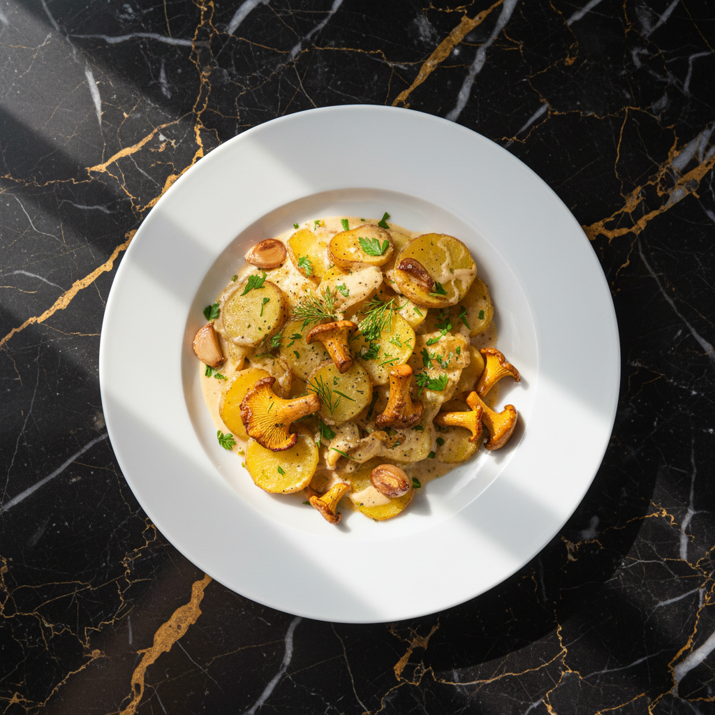 A comforting and rich gratin featuring thinly sliced potatoes layered with sautรฉed chanterelle mushrooms, all baked in a creamy sauce infused with garlic and herbs. This dish highlights Estonia's love for forest mushrooms and hearty root vegetables.