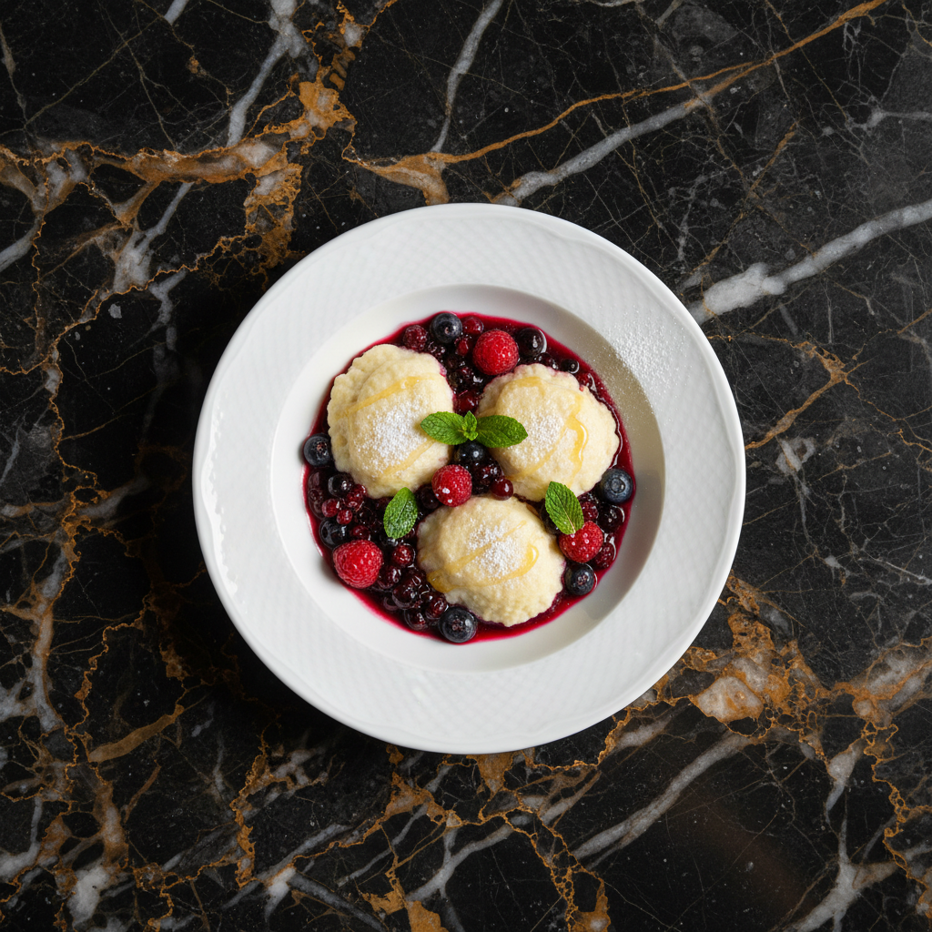 Soft and tender dumplings made from creamy curd cheese, served with a vibrant berry kissel (a fruit soup thickened with starch). This is a delightful and traditional Estonian dessert.