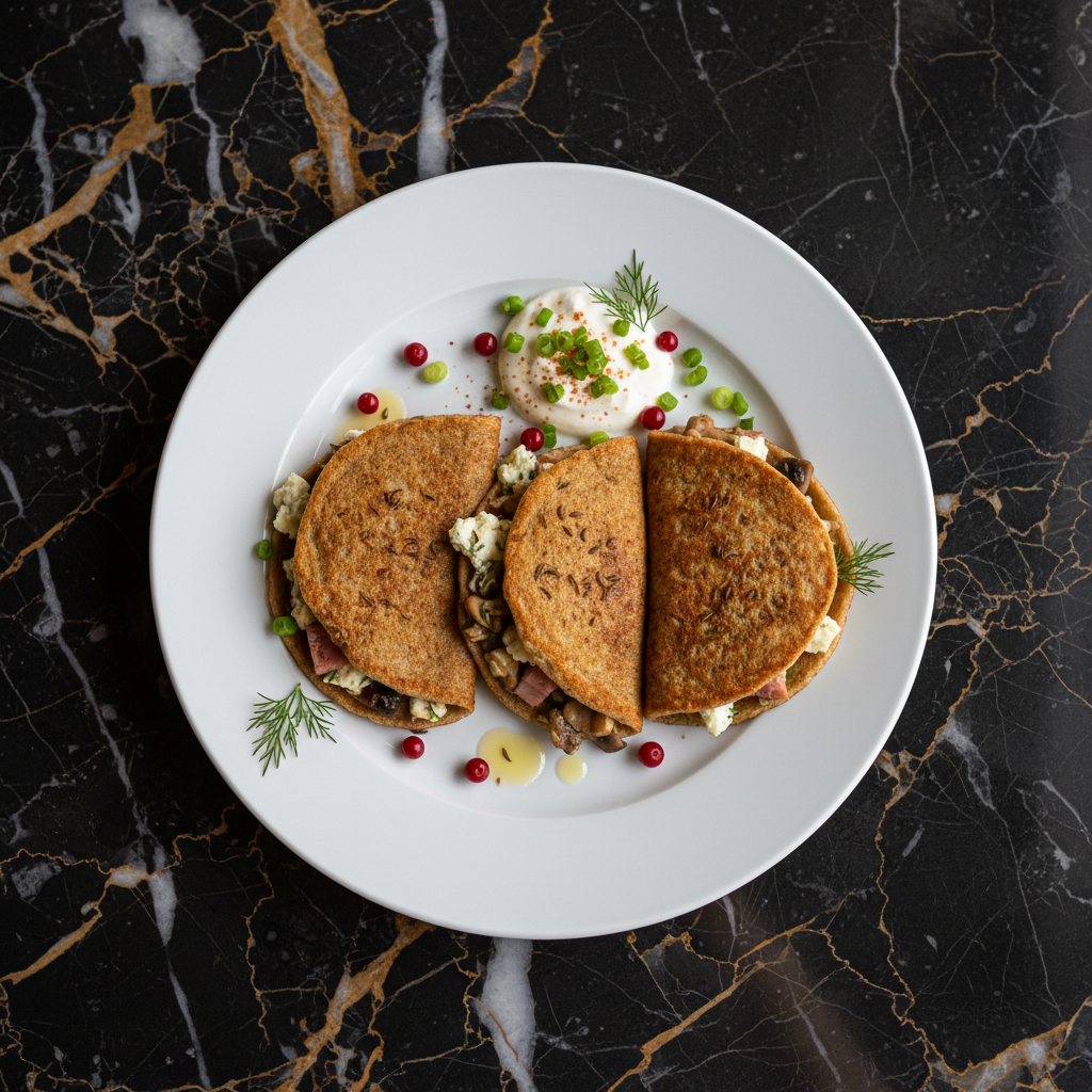 These savory rye flour pancakes, known as 'soolased rukkipannkoogid', are a hearty and flavorful Estonian staple. They are typically thicker than crepes and have a distinct nutty flavor from the rye flour. This recipe features a savory filling, making them suitable for a light meal or appetizer.
