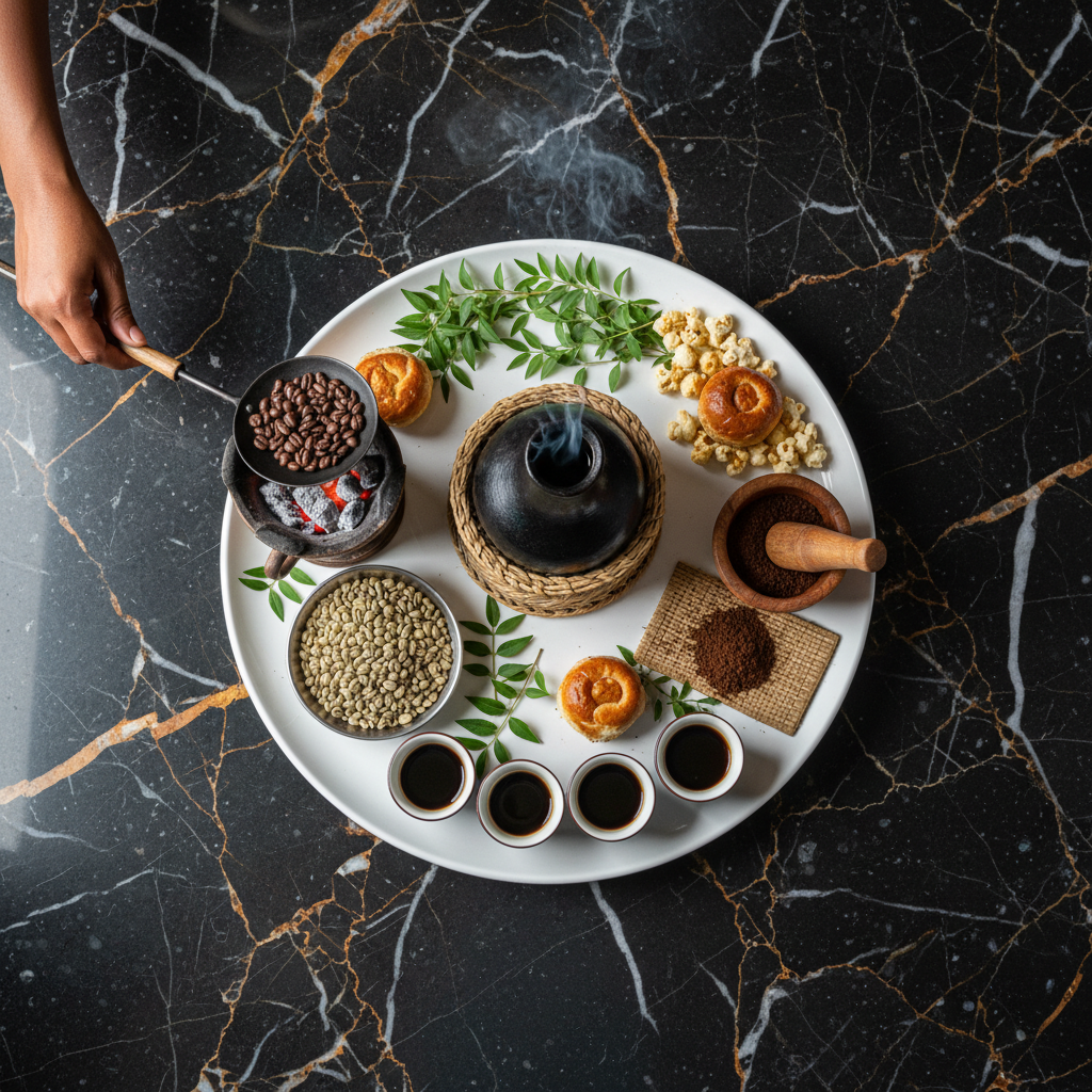 A traditional Ethiopian coffee ceremony, known as Buna, is a cherished social and spiritual ritual involving the roasting, grinding, and brewing of coffee beans in a special clay pot called a jebena. It is an integral part of daily life and hospitality.