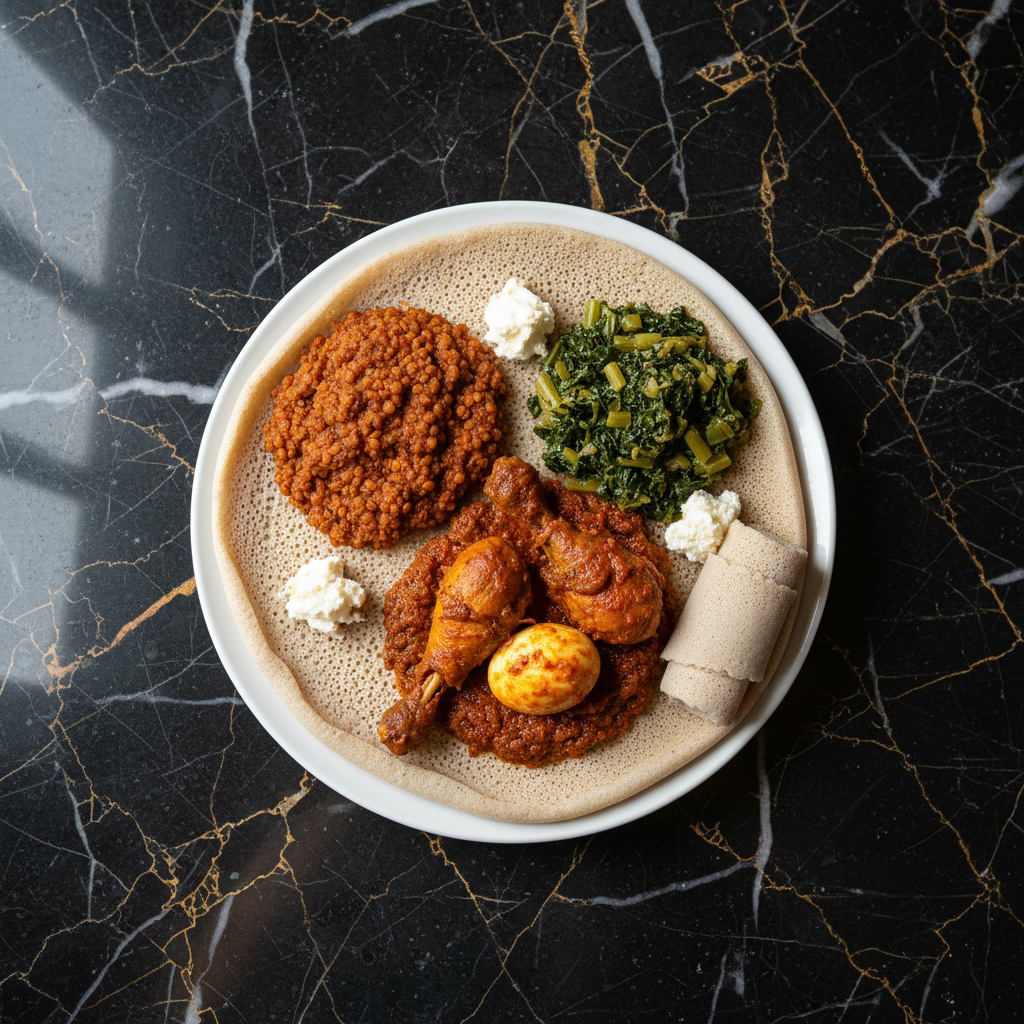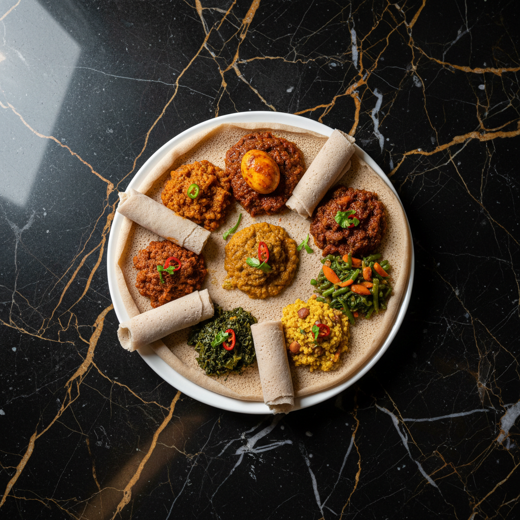 A vibrant Ethiopian feast platter featuring spongy injera bread as the base, generously topped with a variety of flavorful stews (wots) including Doro Wot (spicy chicken stew), Misir Wot (spicy red lentil stew), and Gomen (collard greens stew). Traditionally eaten with the hands, this dish is perfect for sharing.