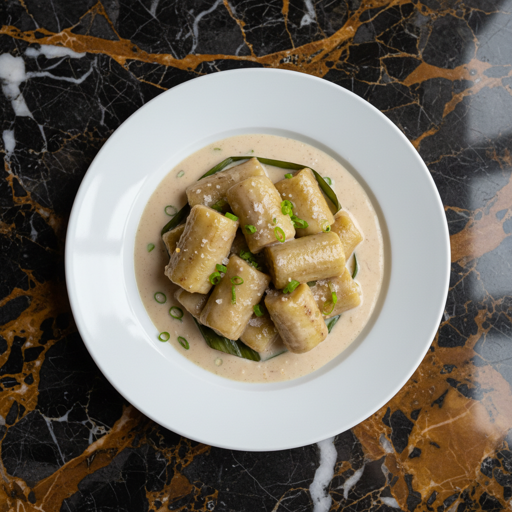 A simple yet flavorful dish of green bananas simmered in creamy coconut milk, seasoned with salt and optional aromatics, serving as a staple side dish.