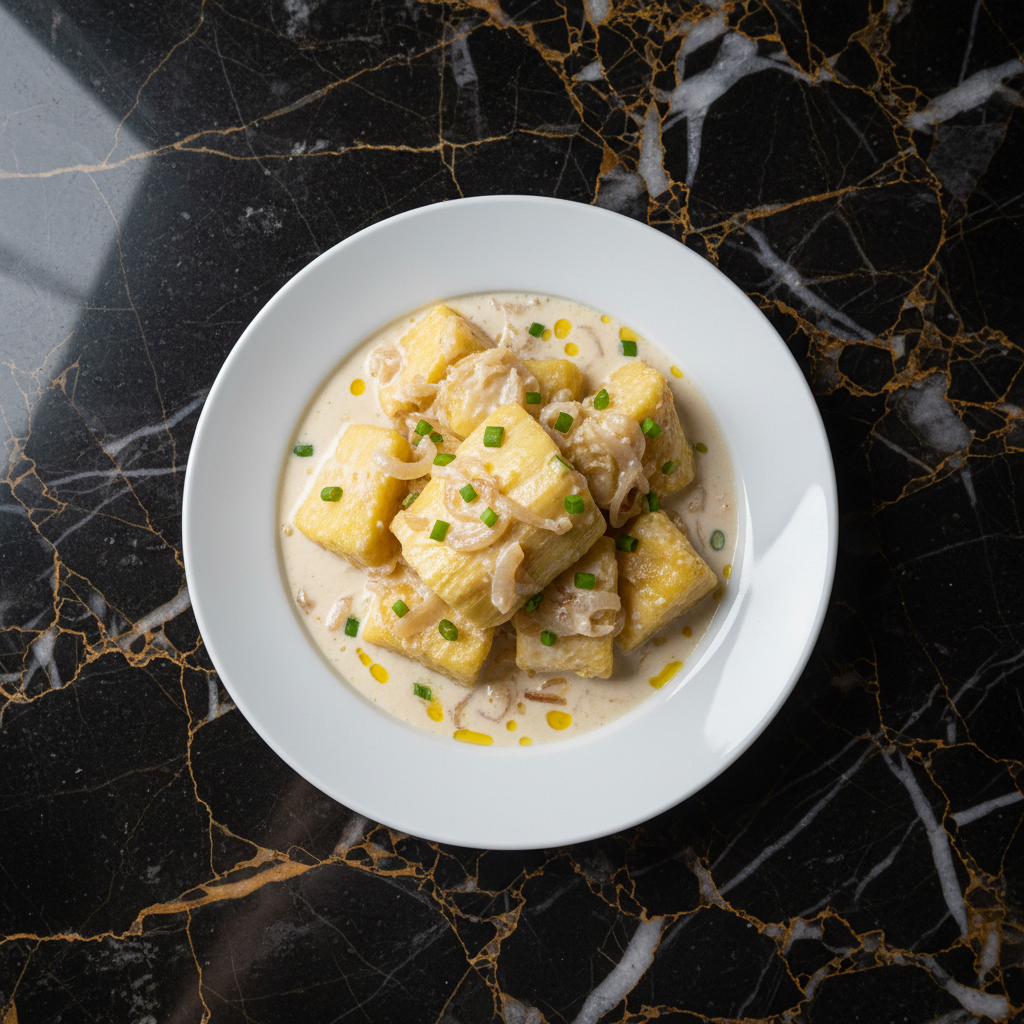 A simple yet incredibly comforting Samoan side dish where tender, boiled breadfruit is simmered in a rich, savory coconut milk sauce infused with the subtle sweetness of onion. It's a staple that perfectly complements many main courses.