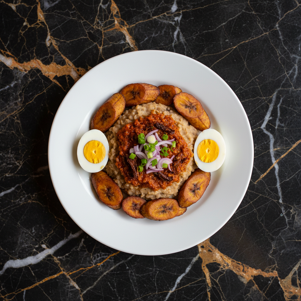 A beloved Lagos street food classic, Ewa Agoyin features tender mashed beans generously topped with a rich, dark, and intensely flavorful spicy palm oil sauce. It's a hearty and satisfying dish, often enjoyed with crusty bread.