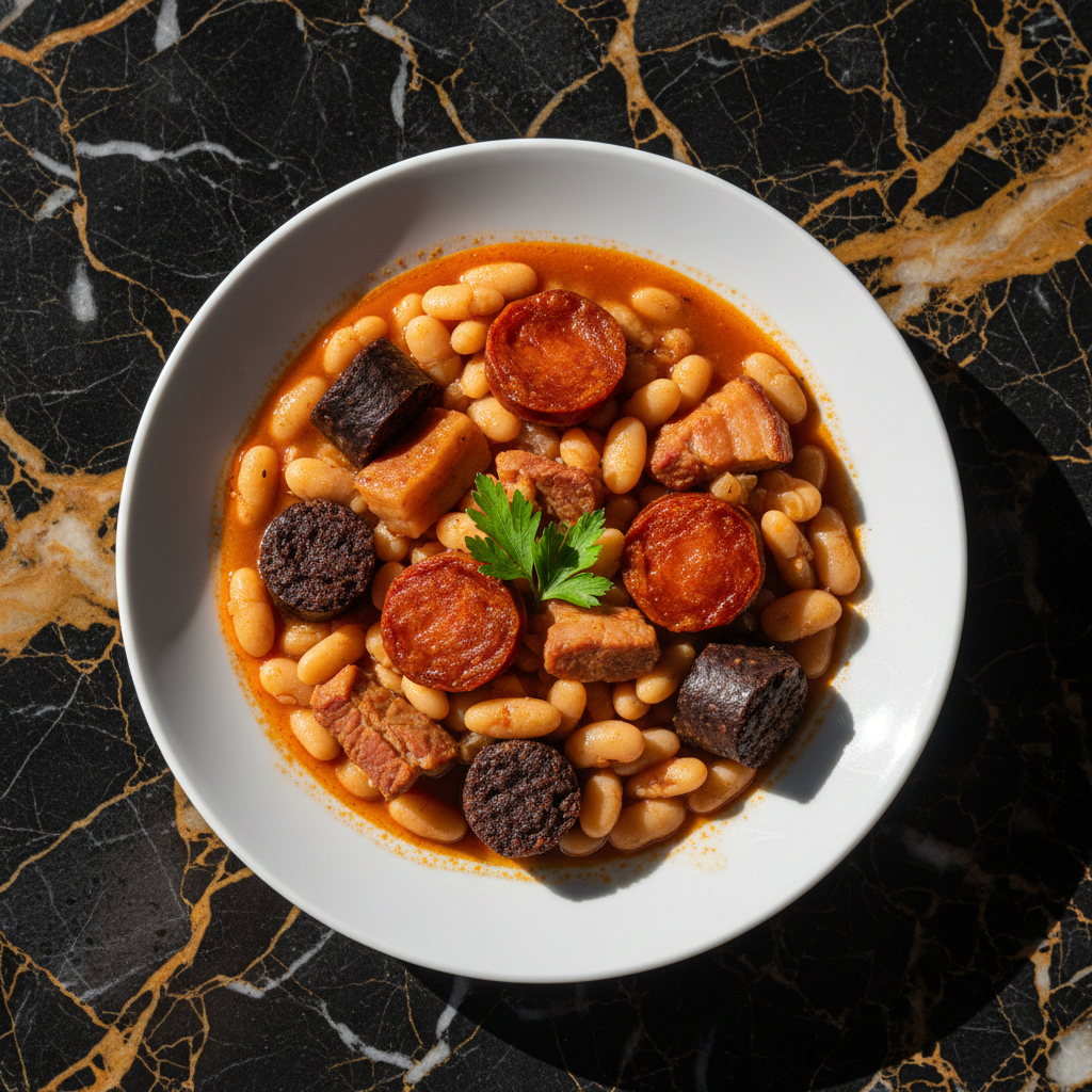 A hearty and traditional Asturian bean stew, featuring tender white beans simmered with flavorful chorizo, morcilla (blood sausage), and rich pork belly. This is ultimate mountain comfort food, perfect for a cold day.