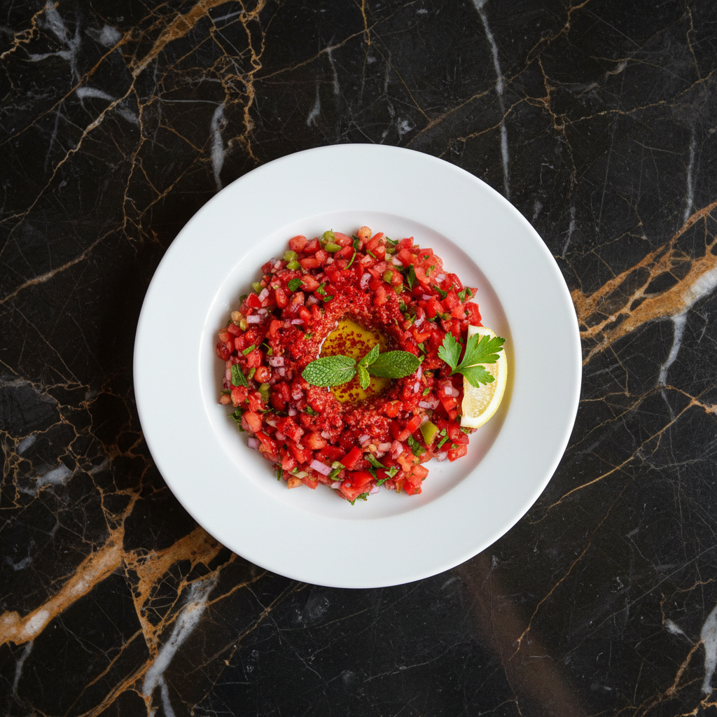 Ezme is a vibrant and refreshing Turkish meze, or appetizer, featuring finely chopped tomatoes, peppers, onions, and fresh herbs, all brought together with a zesty dressing. It's known for its bright flavors and a pleasant kick of spice, making it an essential accompaniment to grilled meats, kebabs, or simply enjoyed with warm flatbread.