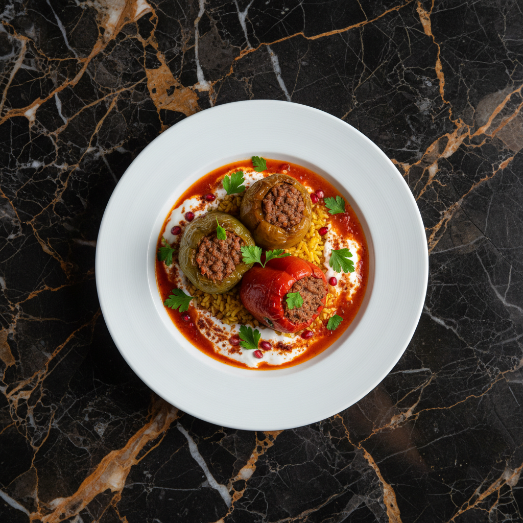 A beloved Turkish home-cooking classic, this dish features tender bell peppers generously filled with a savory mixture of ground beef, rice, fresh herbs, and a hint of tomato. Baked in a light tomato sauce, it's a comforting and flavorful meal.