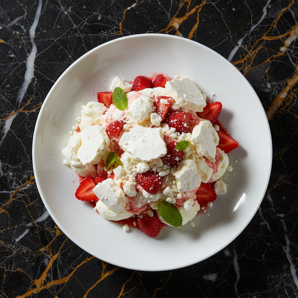 A classic British summer dessert featuring a delightful mix of crushed meringue, whipped cream, and fresh strawberries, creating a delightful textural and flavour contrast.