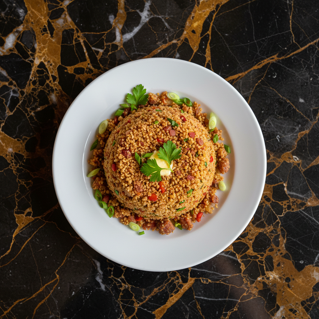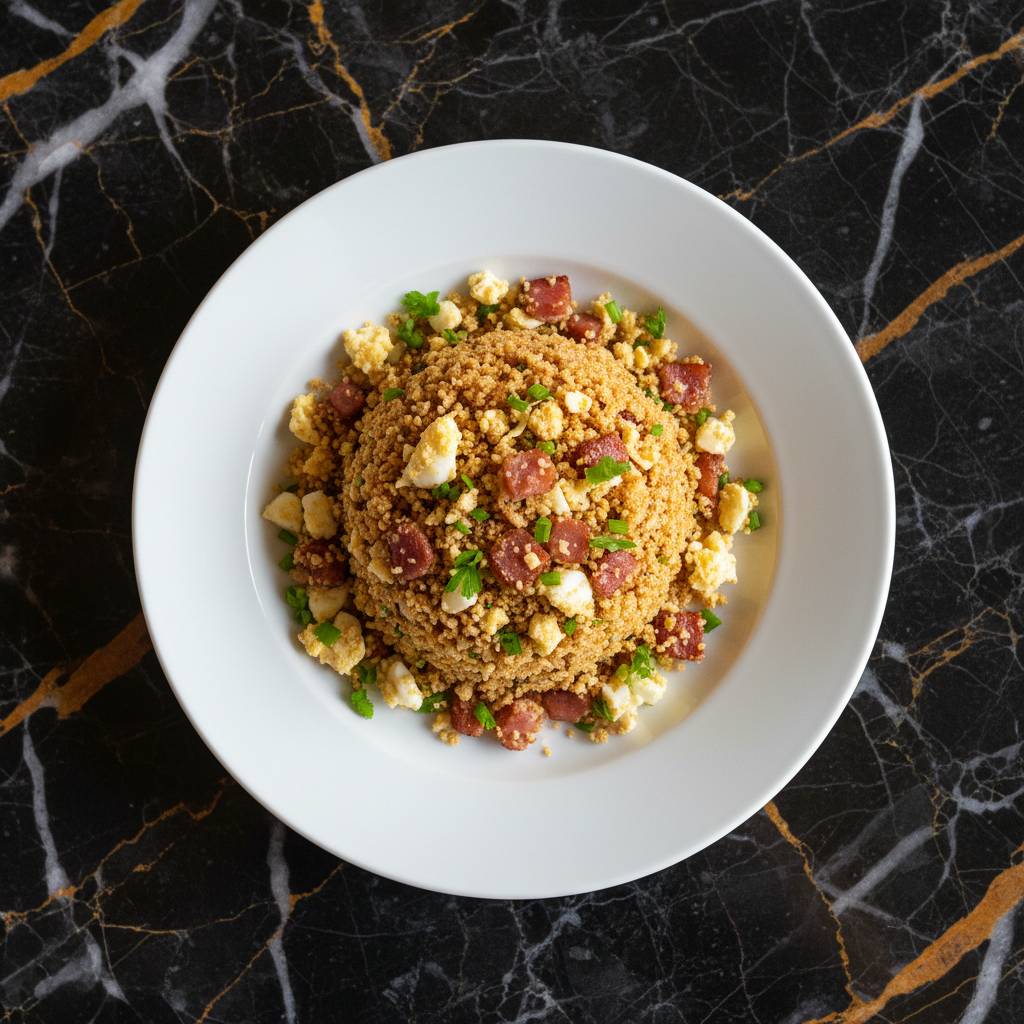 A quintessential Brazilian side dish, this 'complete' farofa is a flavorful and textural delight. Toasted cassava flour (farinha de mandioca) is enriched with crispy bacon, sautรฉed onions, scrambled eggs, and fresh parsley, creating a perfect accompaniment to hearty meats like feijoada or churrasco.