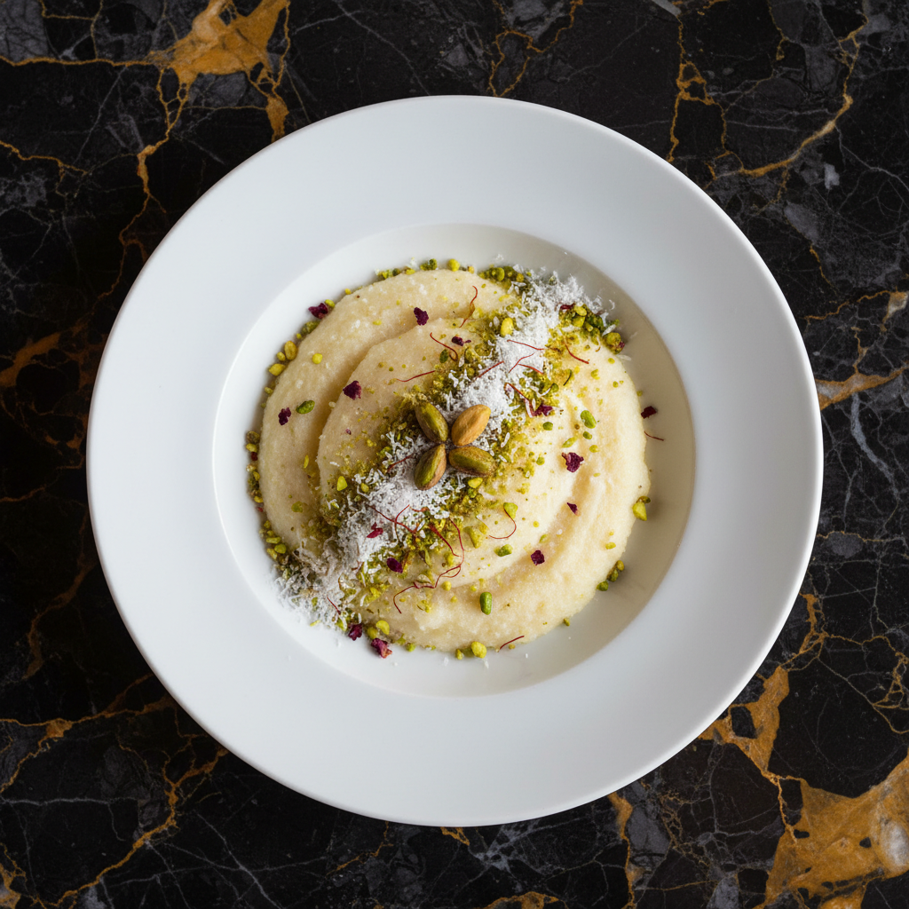 A delightful Iraqi dessert, Fasa Baghdadi is a sweet, creamy pudding made from milk, sugar, and semolina, often flavored with rose water or cardamom and topped with pistachios and coconut. It's a comforting and elegant end to any meal.