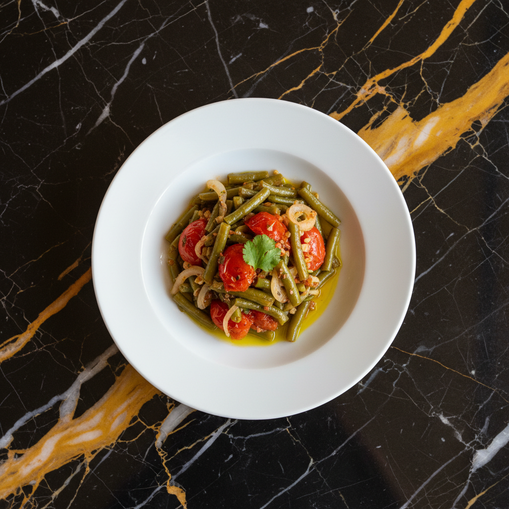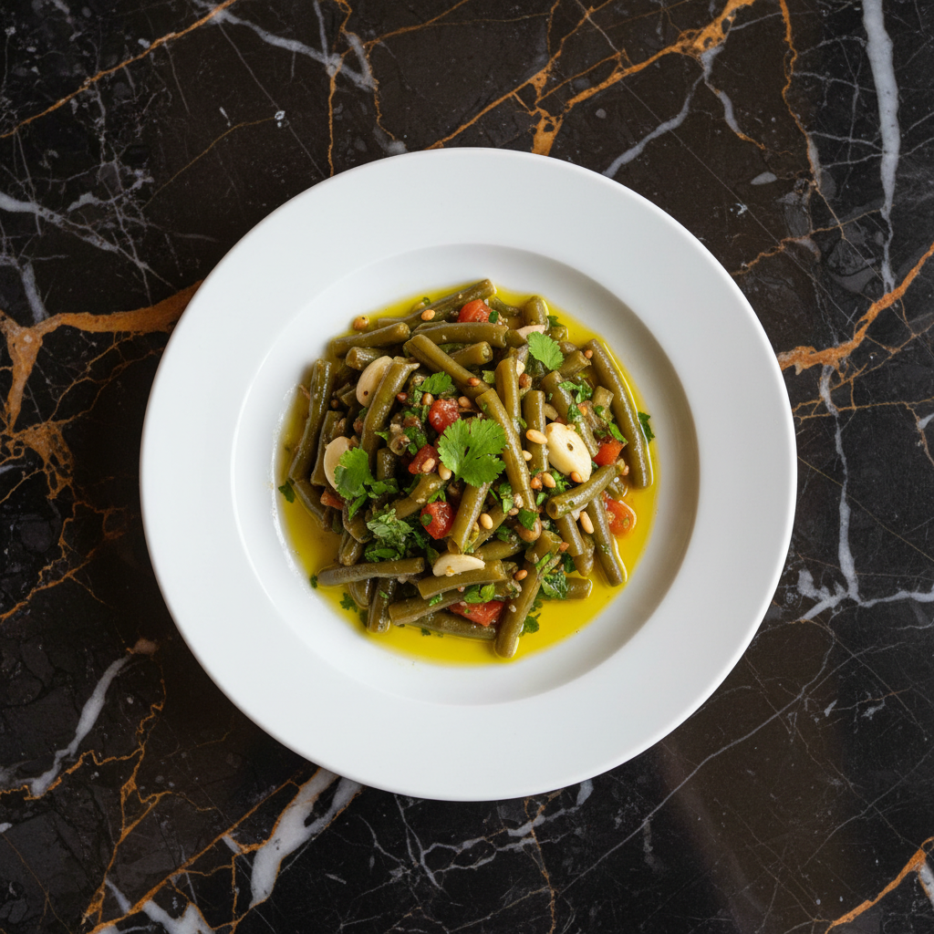 A simple yet flavorful Syrian dish featuring green beans slowly cooked in olive oil with garlic and cilantro, often served as a main or side dish. It highlights the fresh produce common in Syrian cuisine.