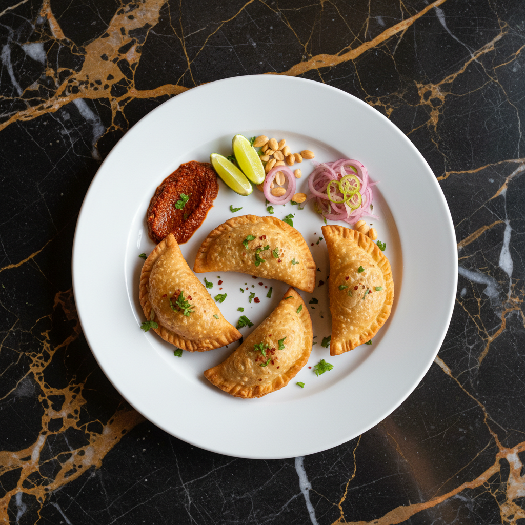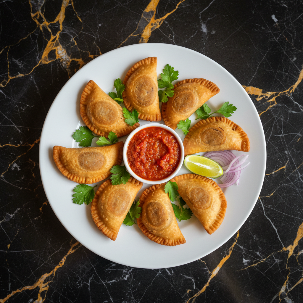 Pastรฉis fritos crocantes e saborosos, recheados com uma mistura picante de peixe ou carne moรญda, cebola e especiarias. Um popular petisco de rua senegalรชs.