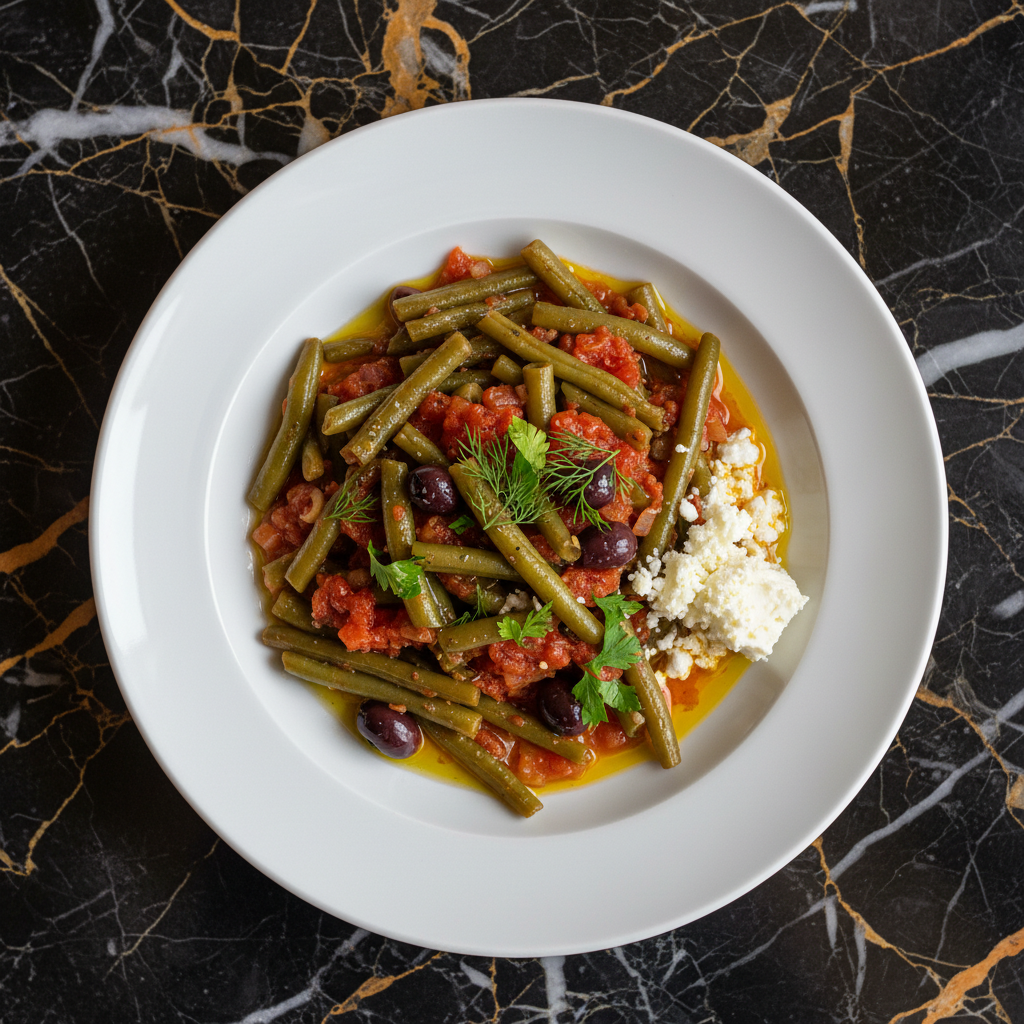 Fasolakia Lathera is a classic Greek dish featuring tender green beans slowly braised in a rich, flavorful sauce of olive oil, tomatoes, and aromatics. The name 'lathera' translates to 'oily,' highlighting the generous use of olive oil which is essential for the dish's signature taste and texture. This dish is often served as a main course or a substantial side, perfect with crusty bread to soak up the delicious sauce.