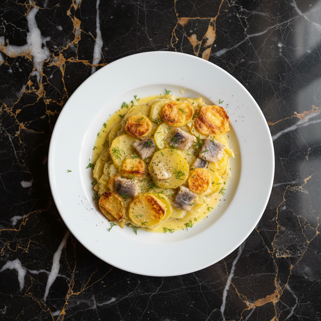 A comforting and savory gratin featuring layers of thinly sliced potatoes and brined herring, baked in a creamy dill sauce. This dish offers a delightful combination of textures and flavors, showcasing classic Finnish ingredients.