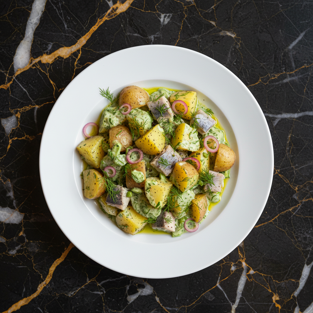 A refreshing and hearty salad featuring pickled herring, boiled potatoes, and a creamy dill dressing, often enjoyed during summer gatherings.