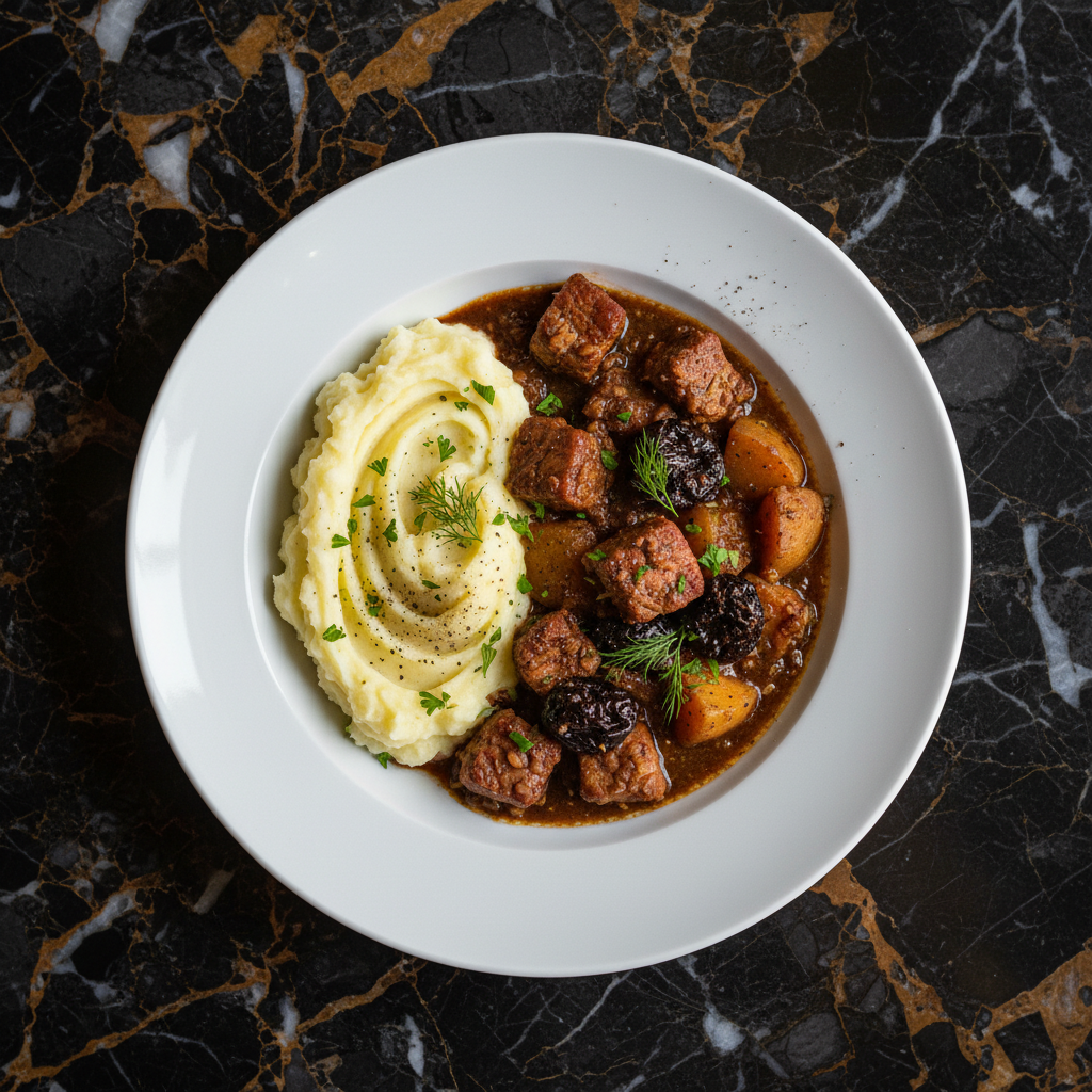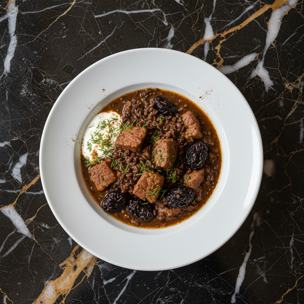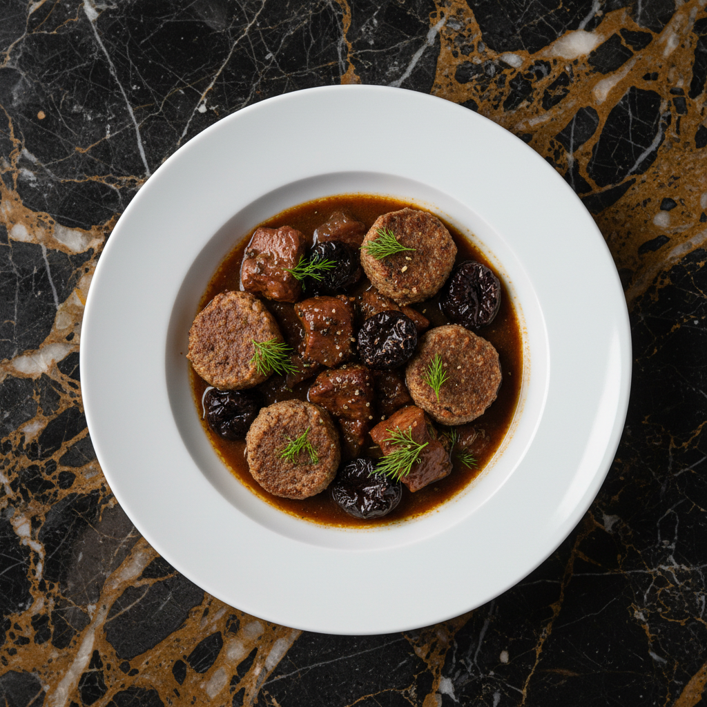 A hearty and flavorful stew featuring tender pork, sweet prunes, and aromatic spices, served with rustic rye dumplings. This dish embodies the comforting, traditional flavors of Finnish home cooking.
