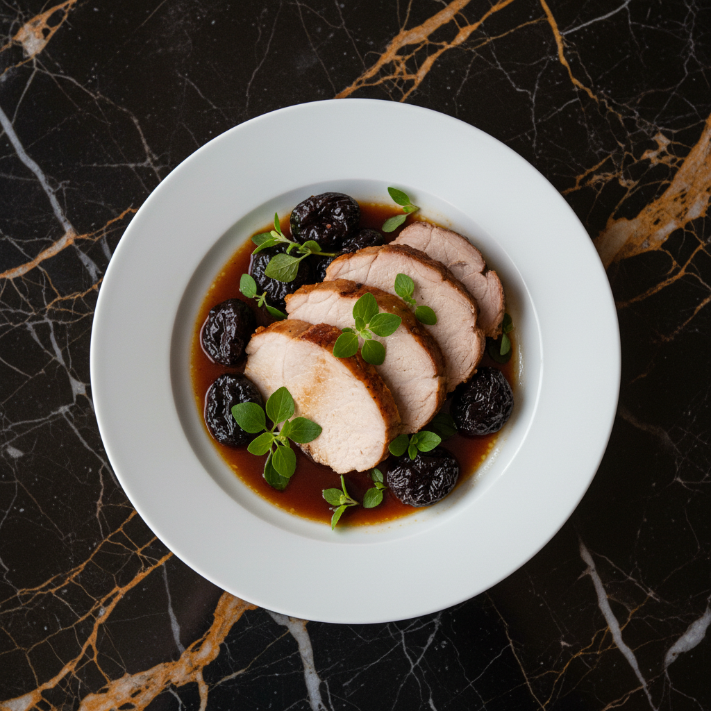 A succulent pork roast infused with the sweet, slightly tart flavor of prunes and the aromatic, earthy notes of marjoram. This dish is a comforting and flavorful centerpiece, often prepared for special occasions.