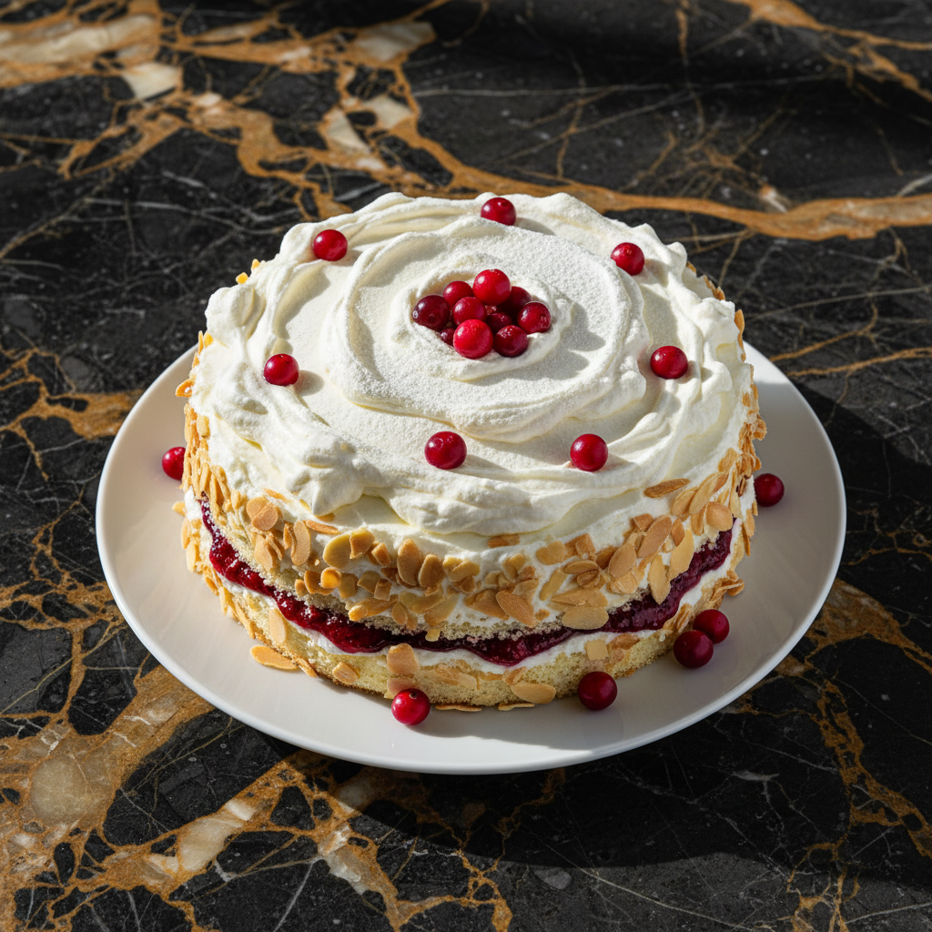 A delightful Finnish layer cake featuring a light sponge cake, tart lingonberry jam, and a whipped cream frosting, often decorated with toasted almonds. It's a popular choice for celebrations and fika (coffee breaks).
